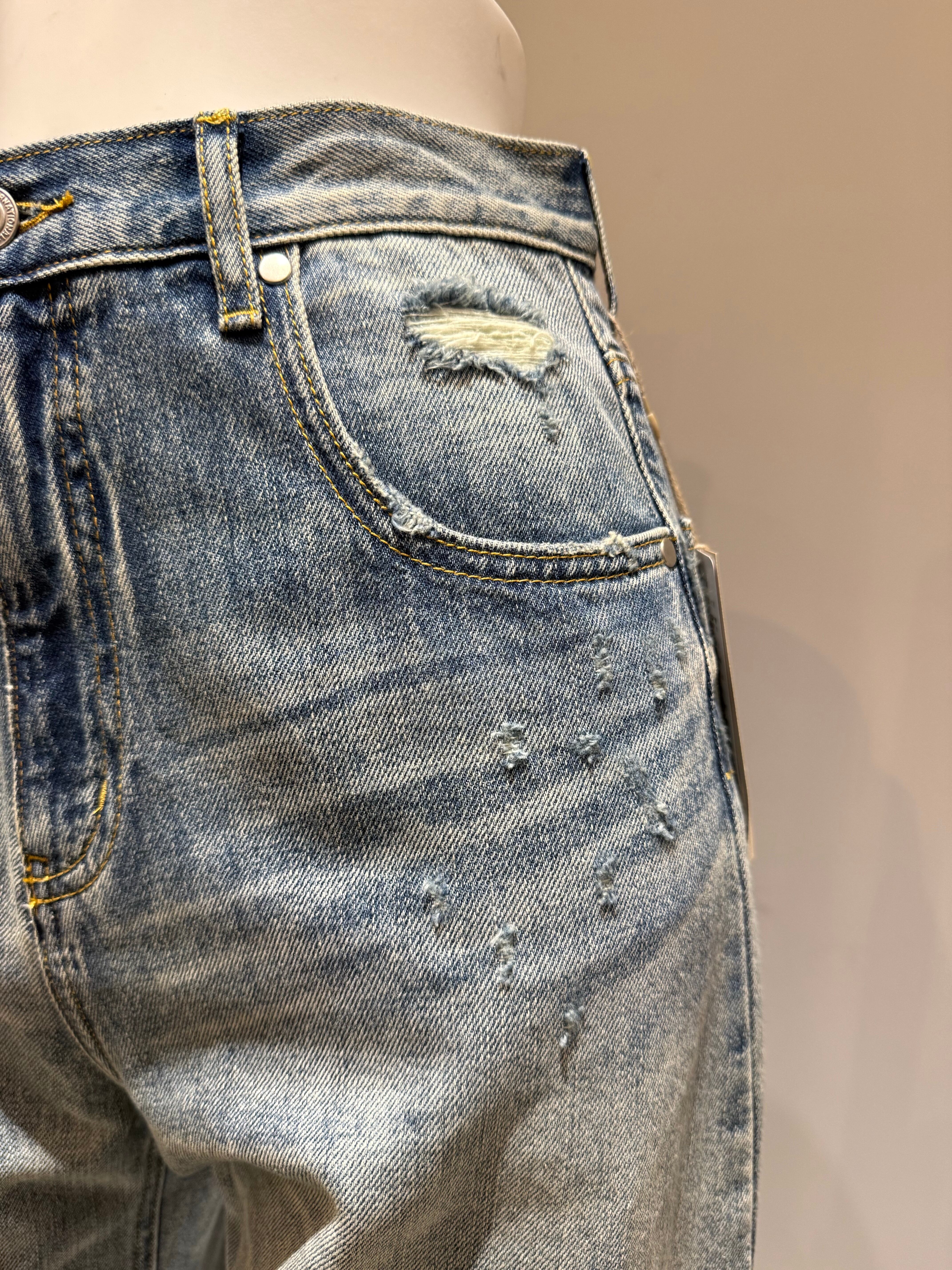 カラーはインディゴウォッシュの「ブリーチ」、色の落ち具合やアタリ、ヒゲなどの加工は本格的仕様で、やり過ぎない程良いダメージ加工がデニム好きさんにも大好評です◎