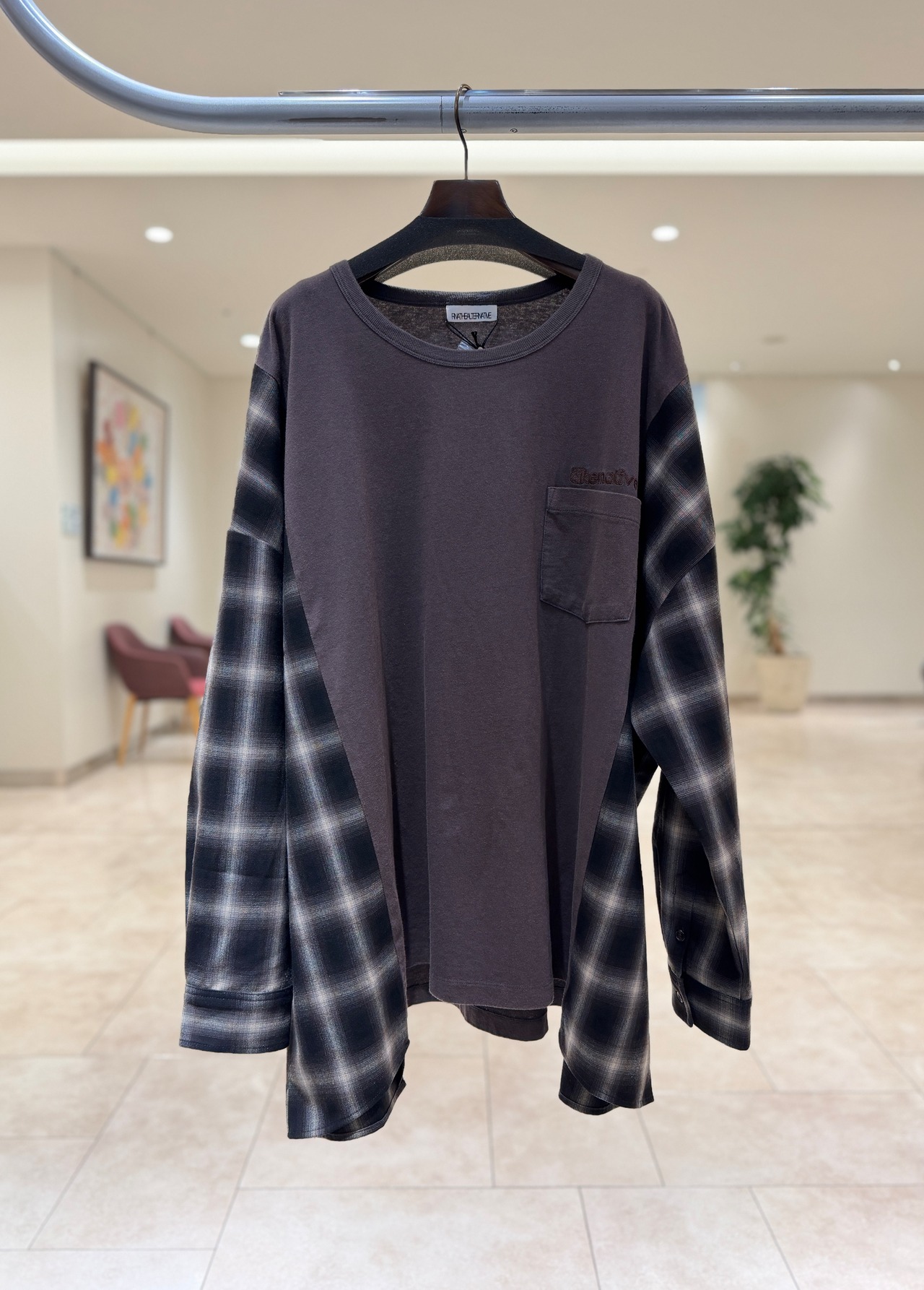 Tシャツをベースにチェックシャツを切り替えて縫い合わせたようなデザインが一枚で着映えのするアイテムです。