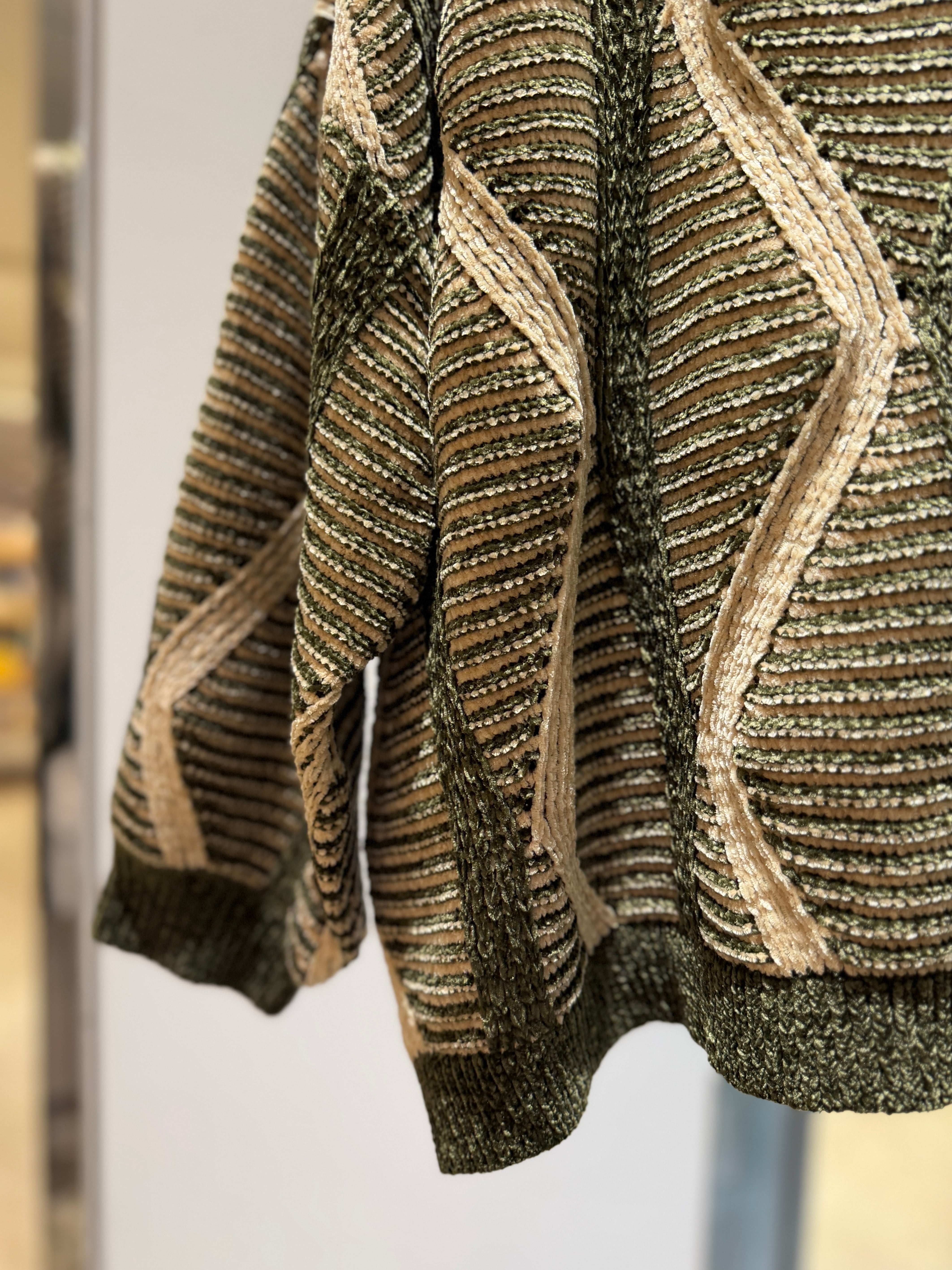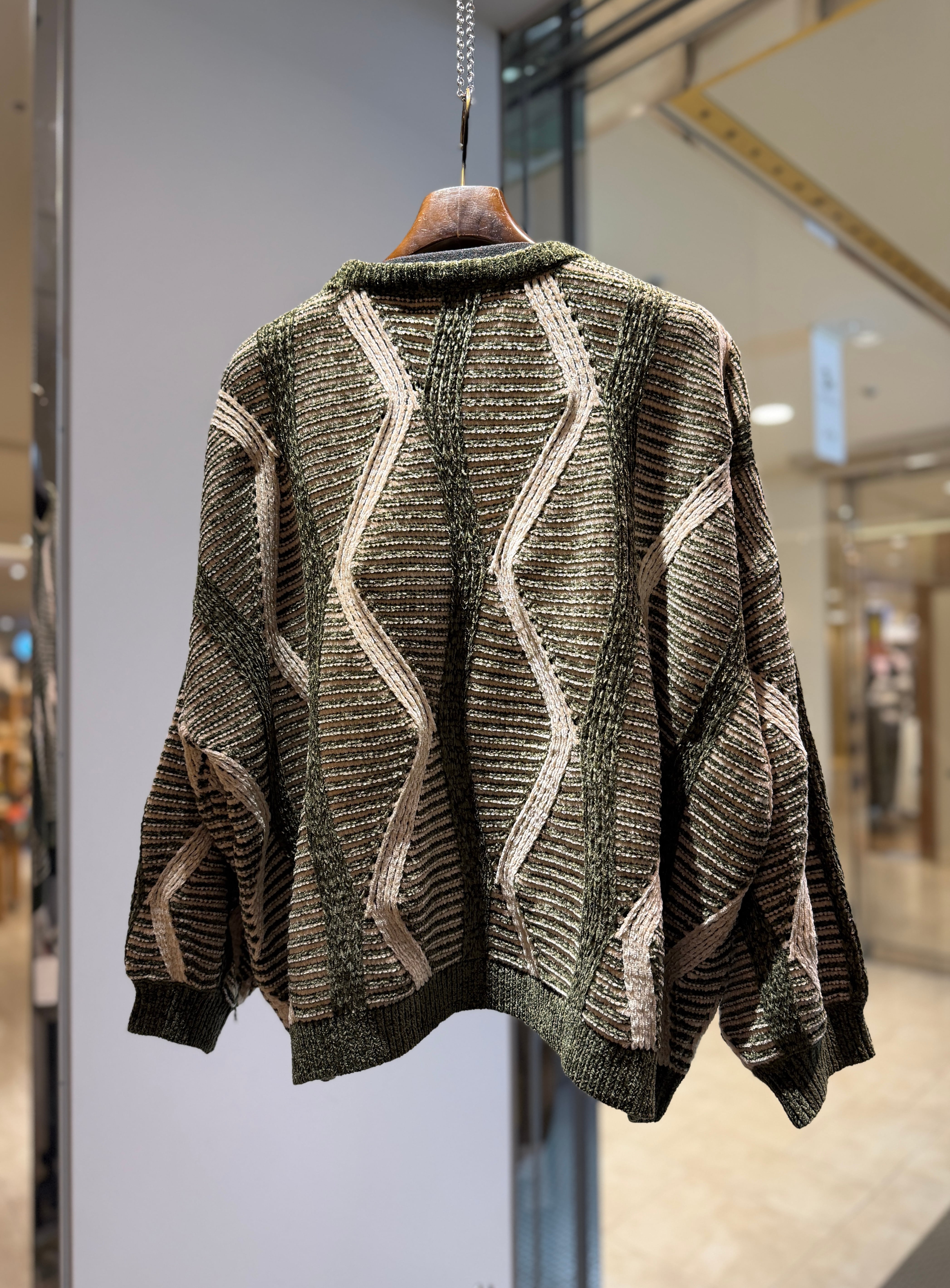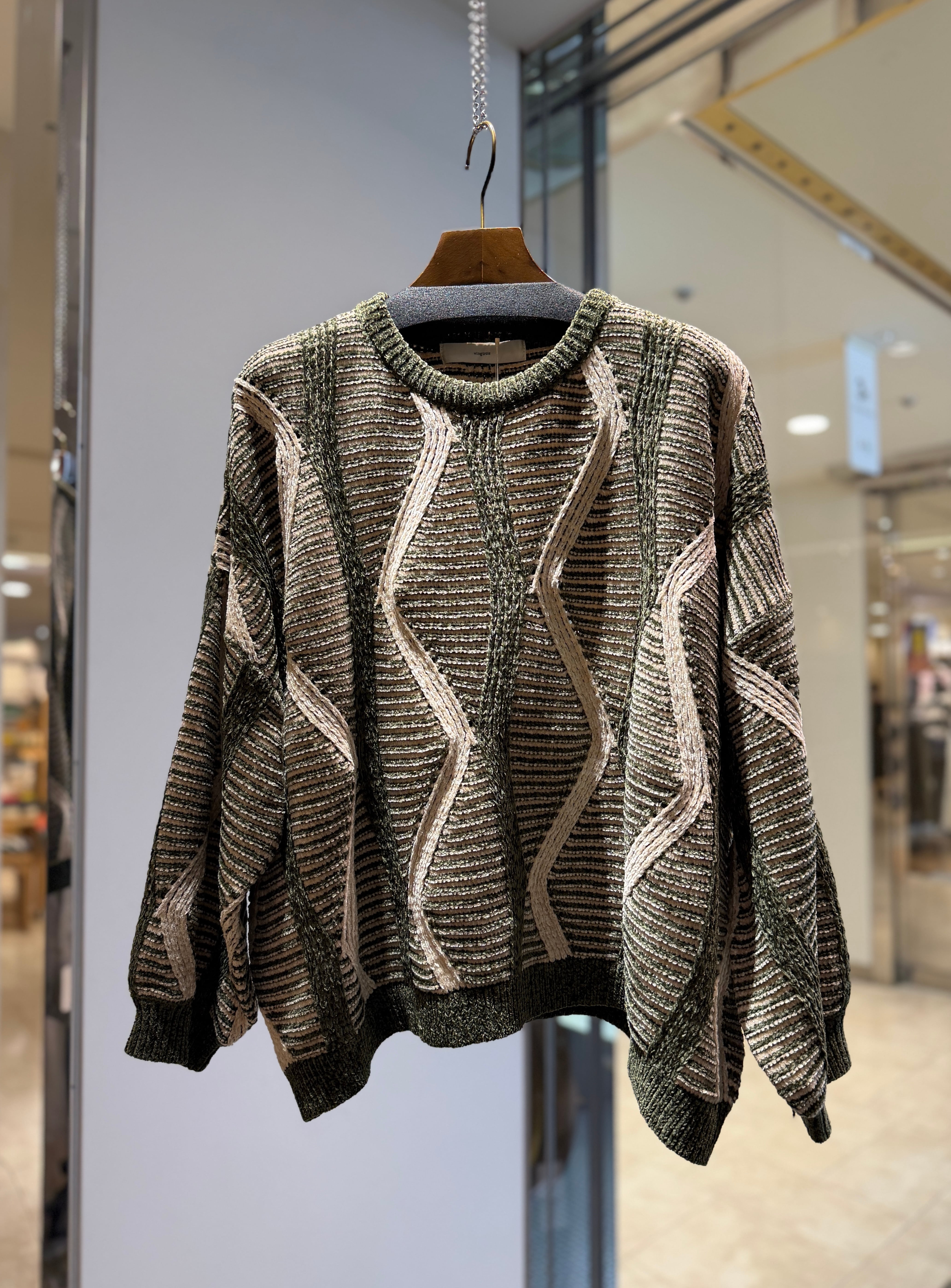 幾何学的なデザインが存在感のあるモールニットトップスが登場しました。