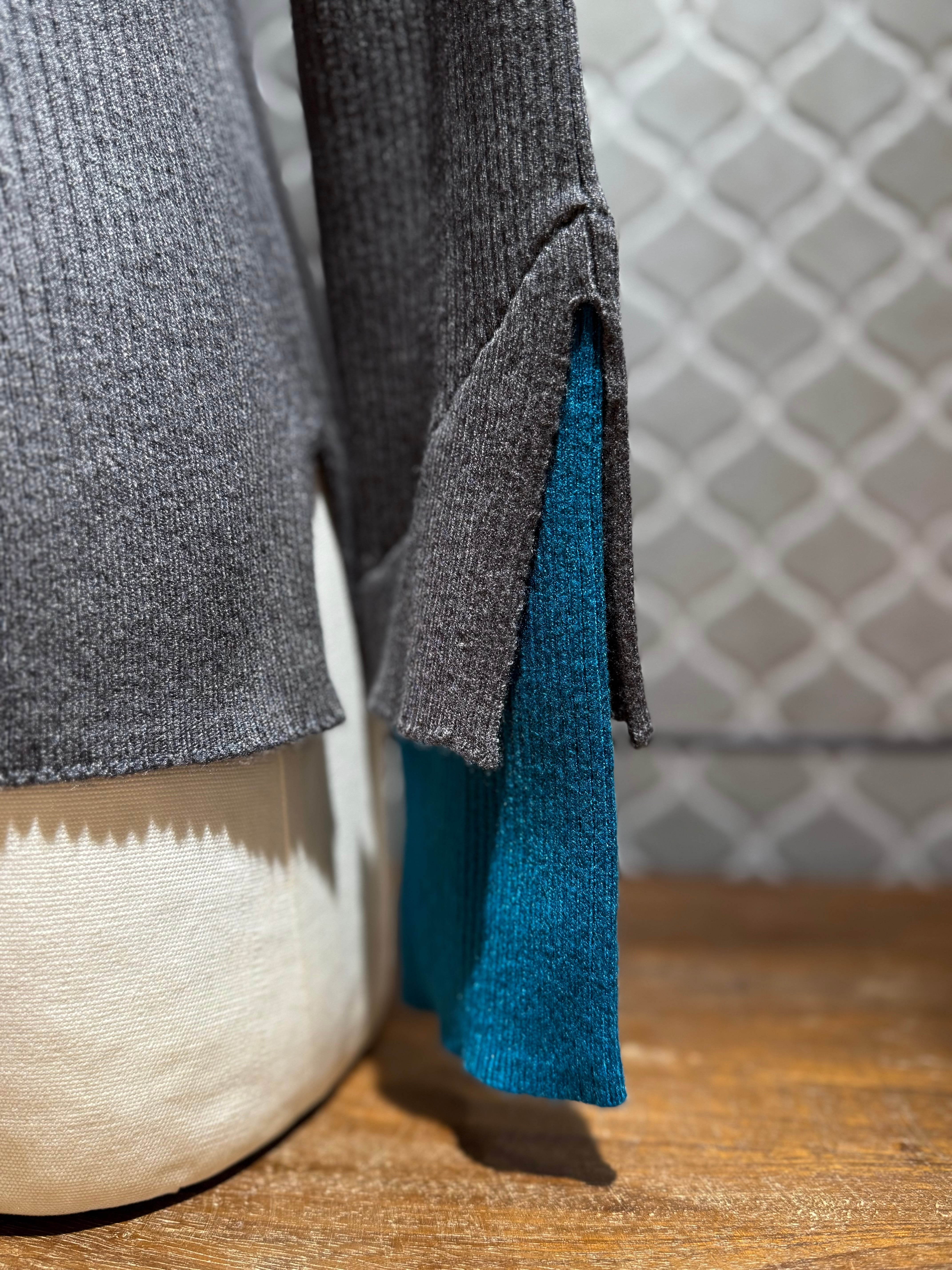 ネックと袖口が2重のバイカラーになったタートルニット。
