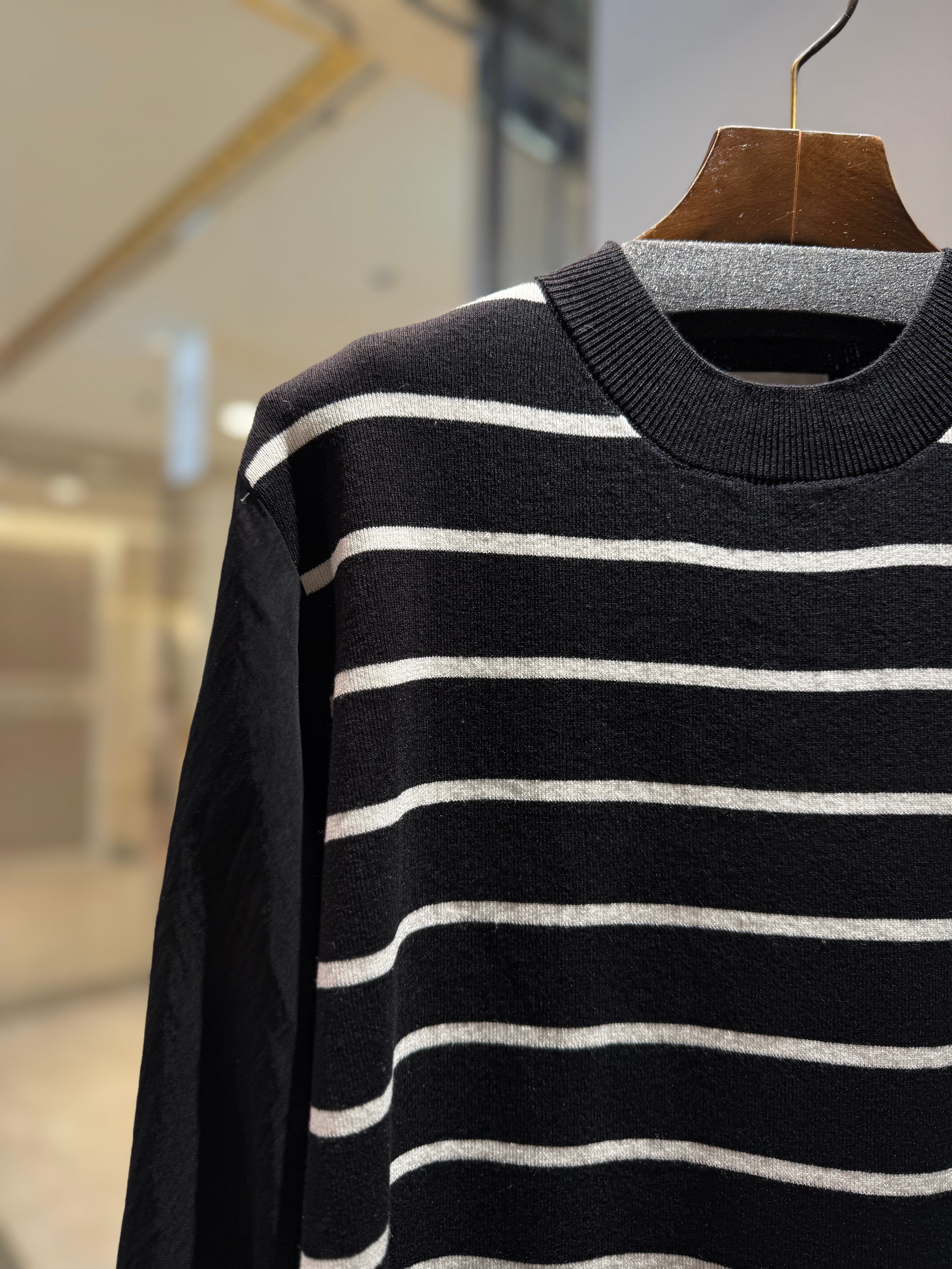 ボーダーのニットと布帛を組み合わせたドッキングトップス。