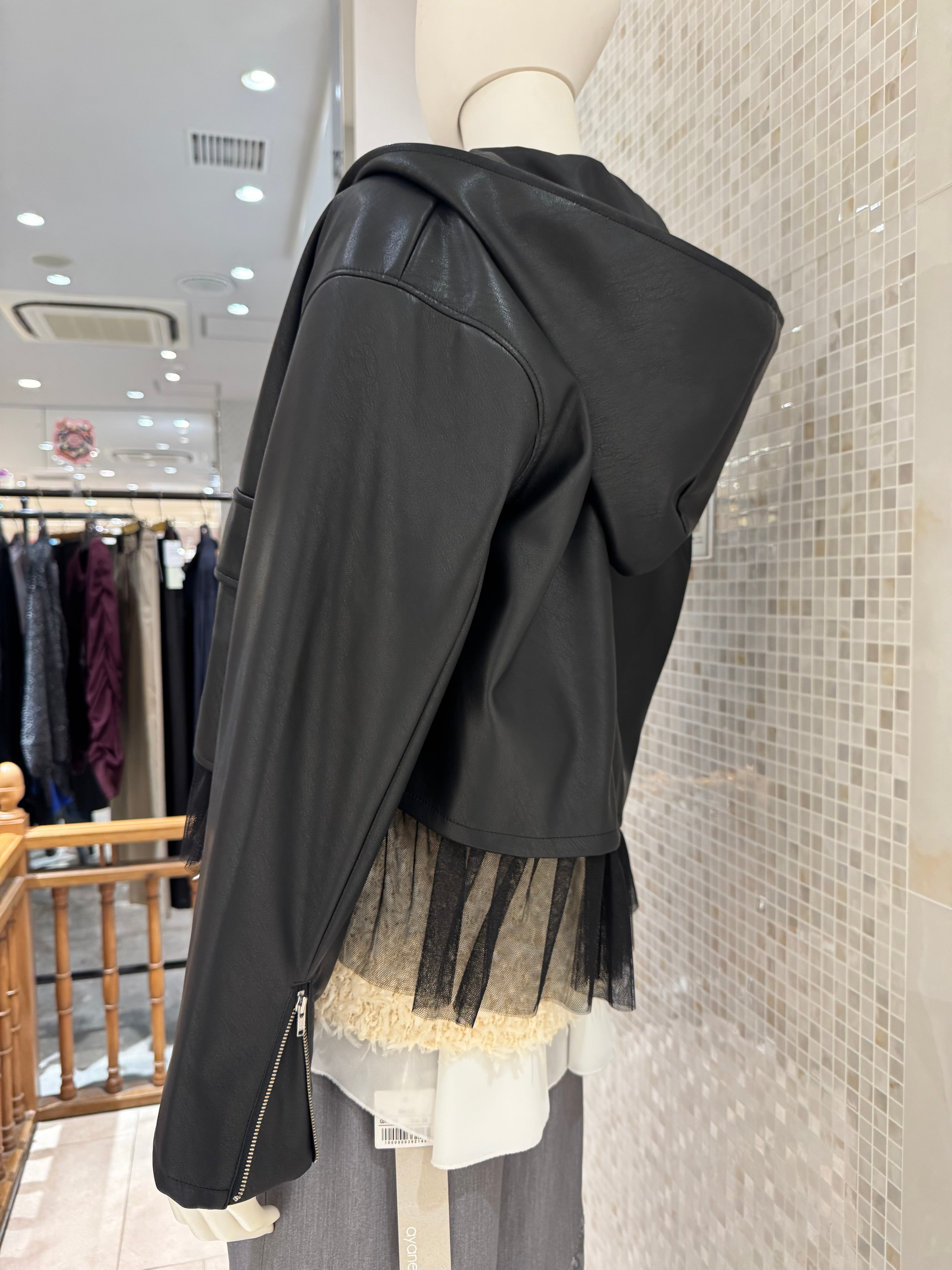無骨なレザージャケットをチュールとドッキングさせることによりレディな印象を与えています。