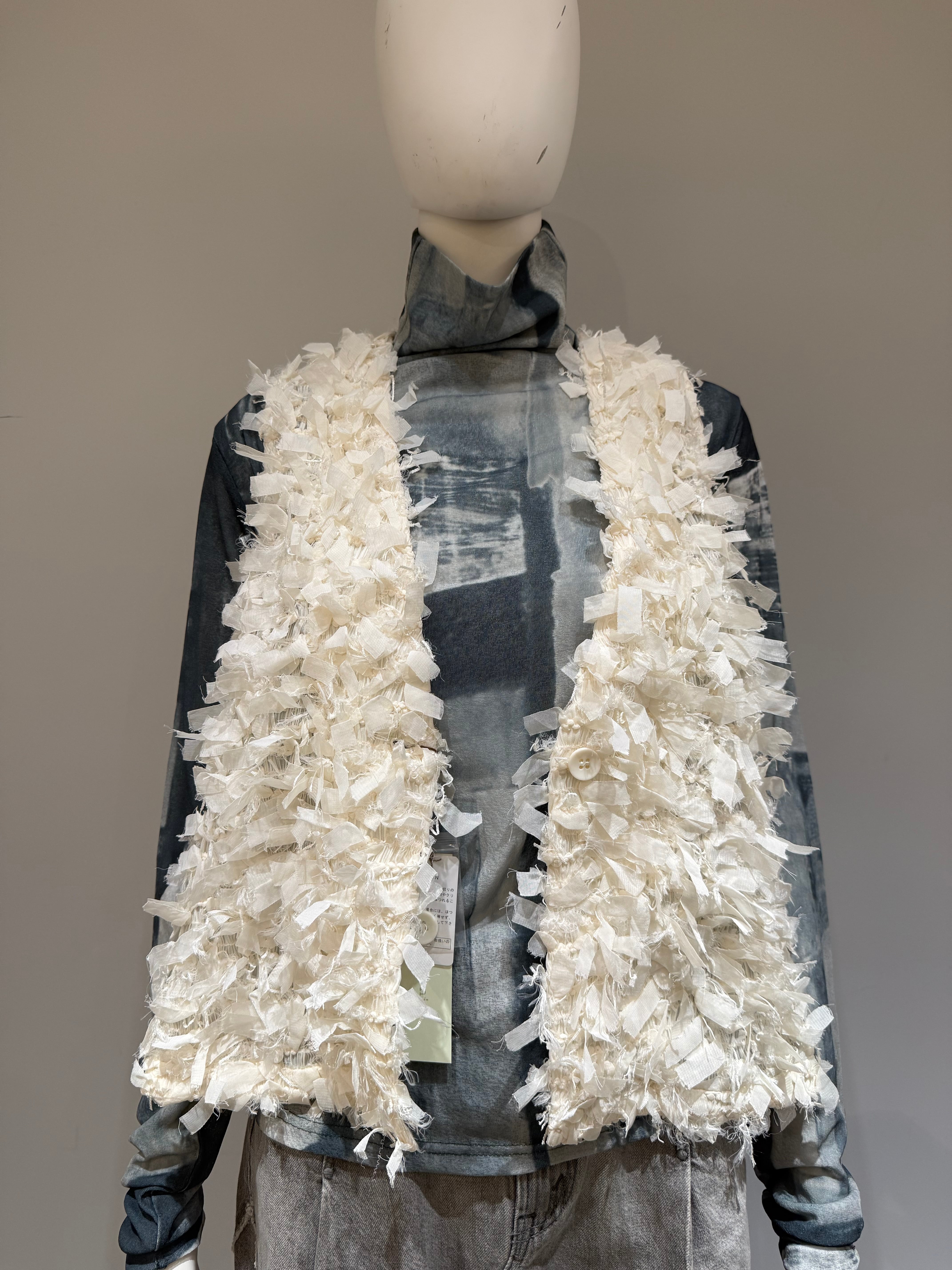 さみしくなりがちな冬のスタイリングに華やかさをプラスしてくれるリボンヤーンベスト。