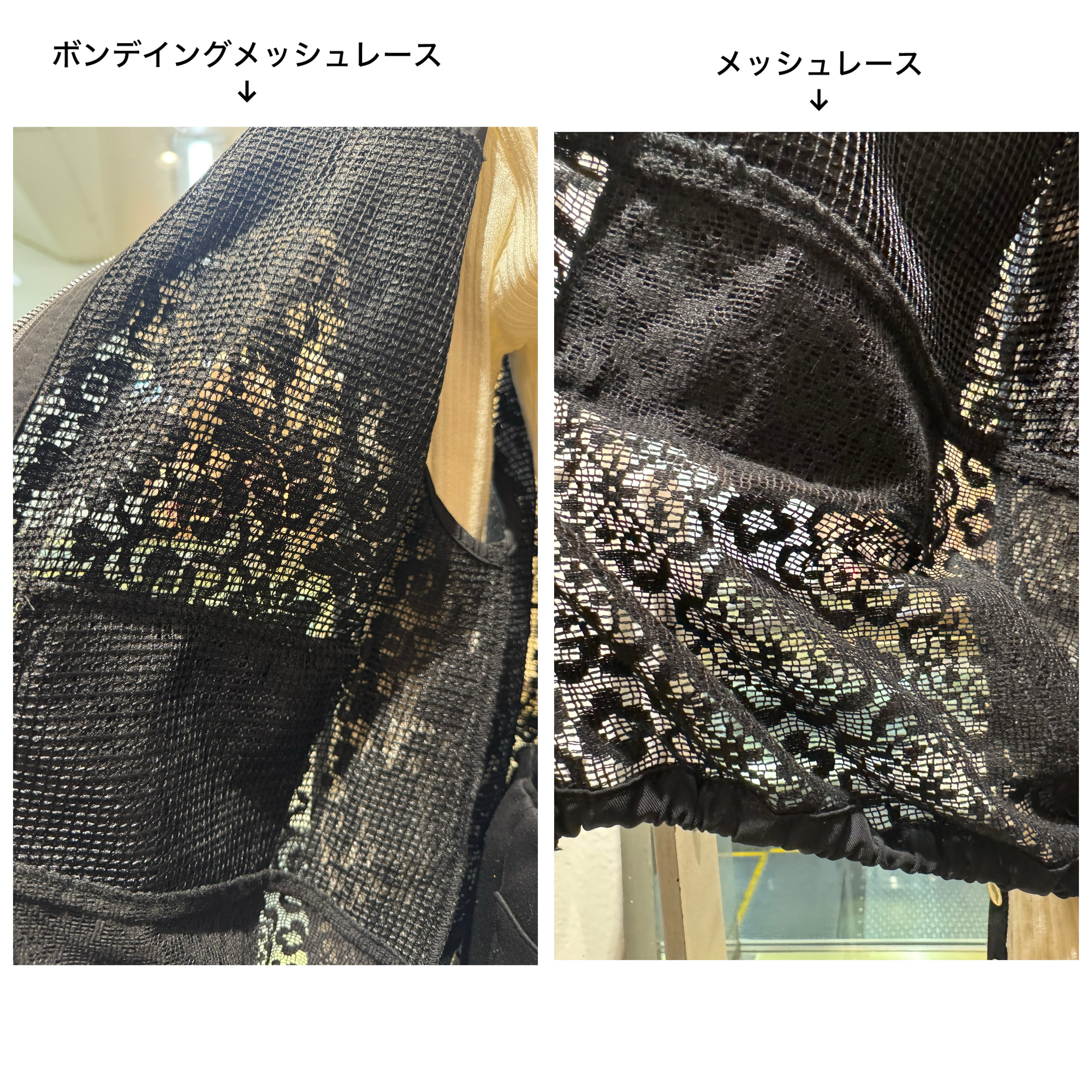 素材感:少し張り感のあるメッシュレースとしっかりとした張り感のあるボンディングメッシュレースを使用しています。無地部分はナイロンタッチのポリエステルです。
