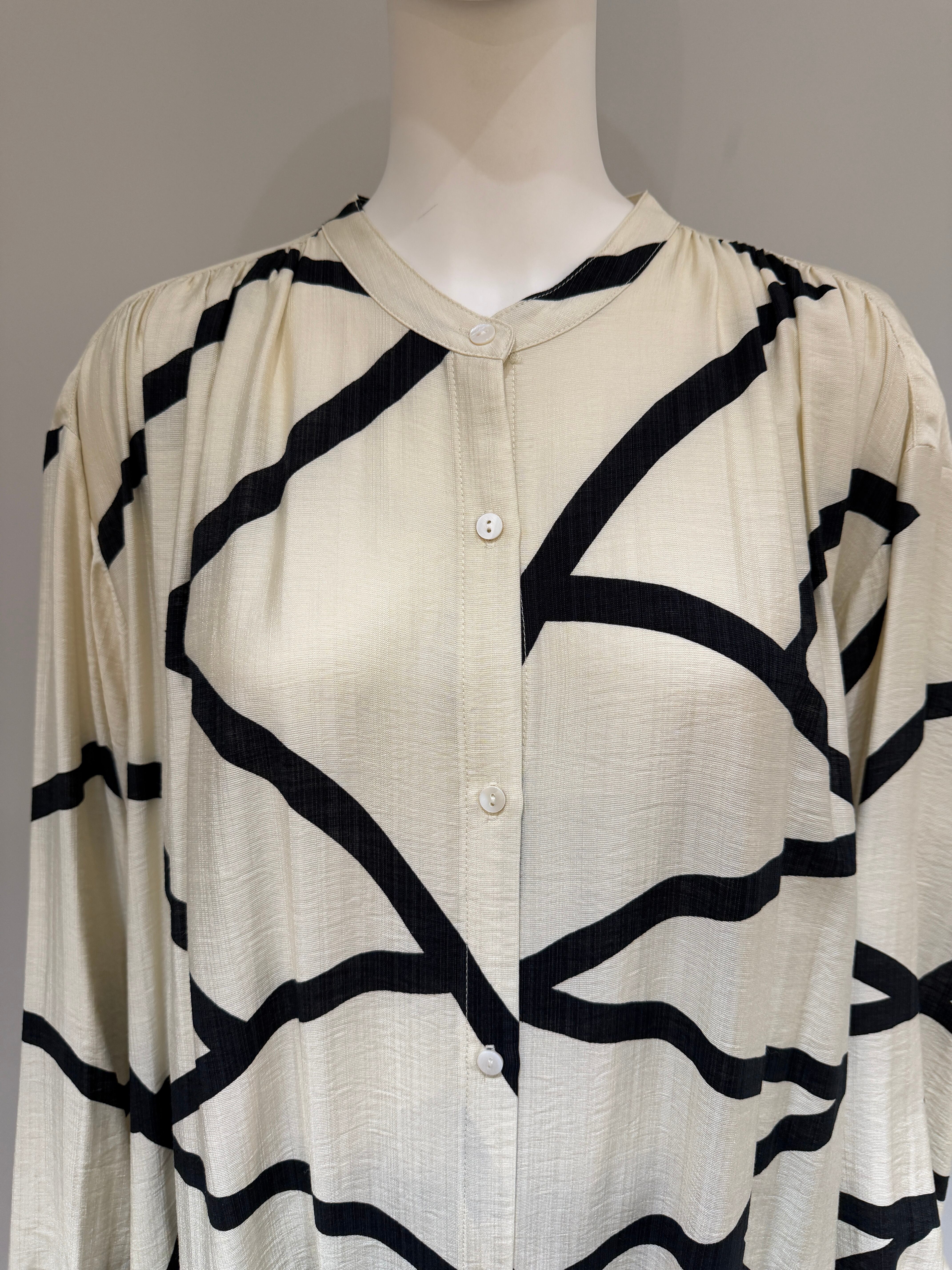 さらりとした素材感とゆとりのあるシルエットで、袖口にはさりげないギャザーを寄せ、ボリュームのあるスリーブが女性らしい柔らかさをプラス。