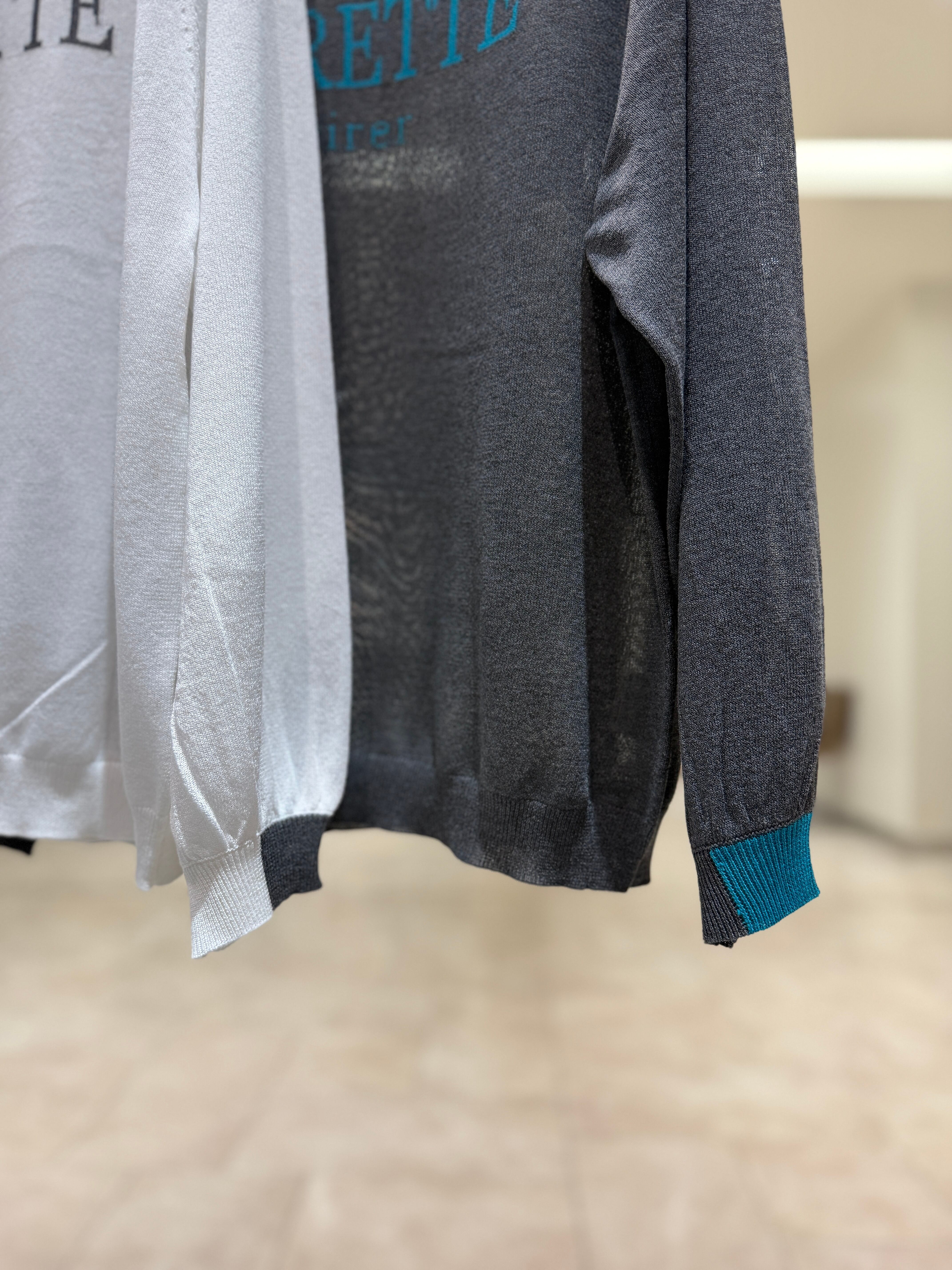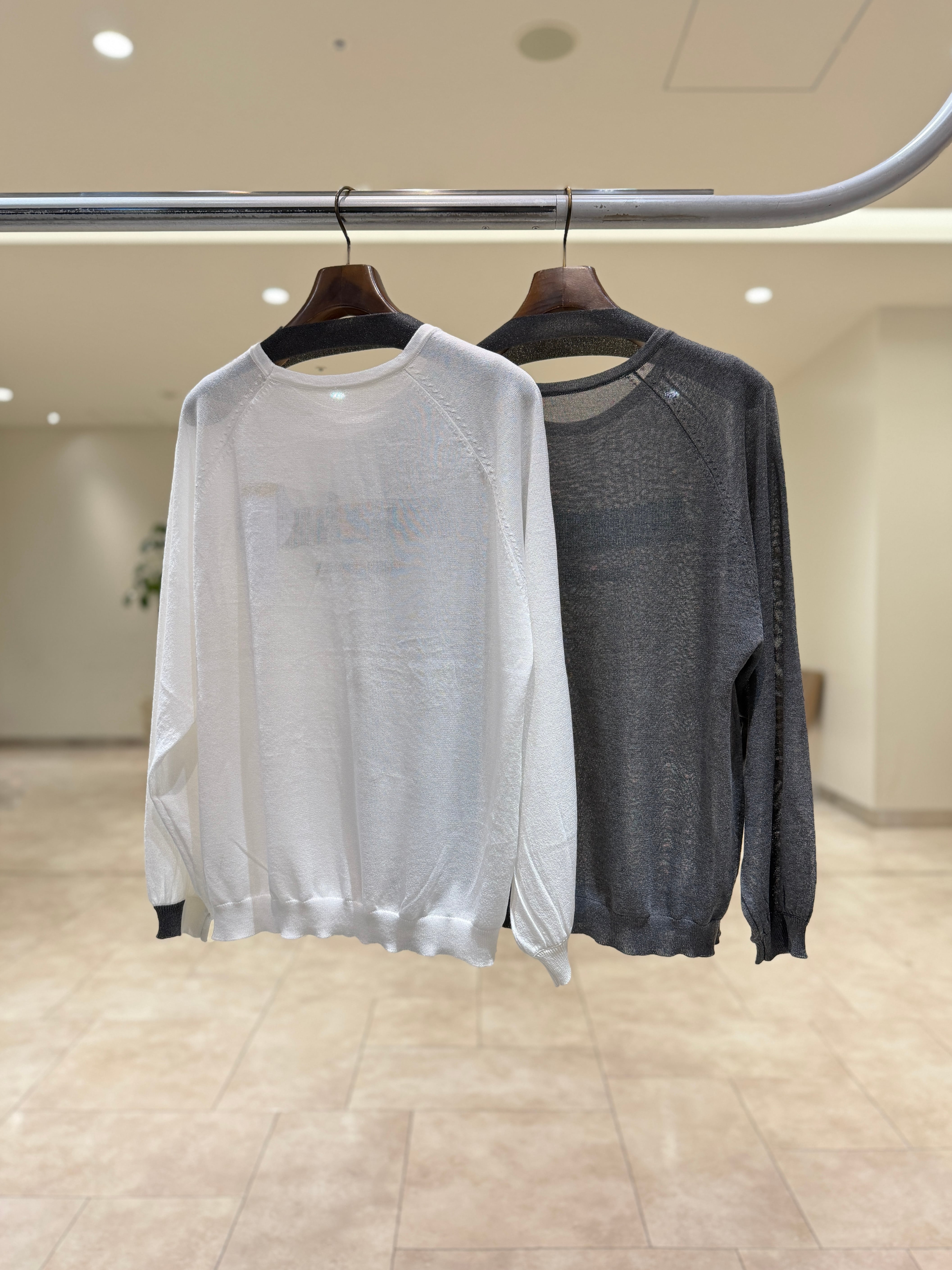 14Gのレーヨンとポリエステルをブレンドした強撚糸を使用し、シャリ感と清涼感あるさらりとした肌触りに仕上げたニットです。