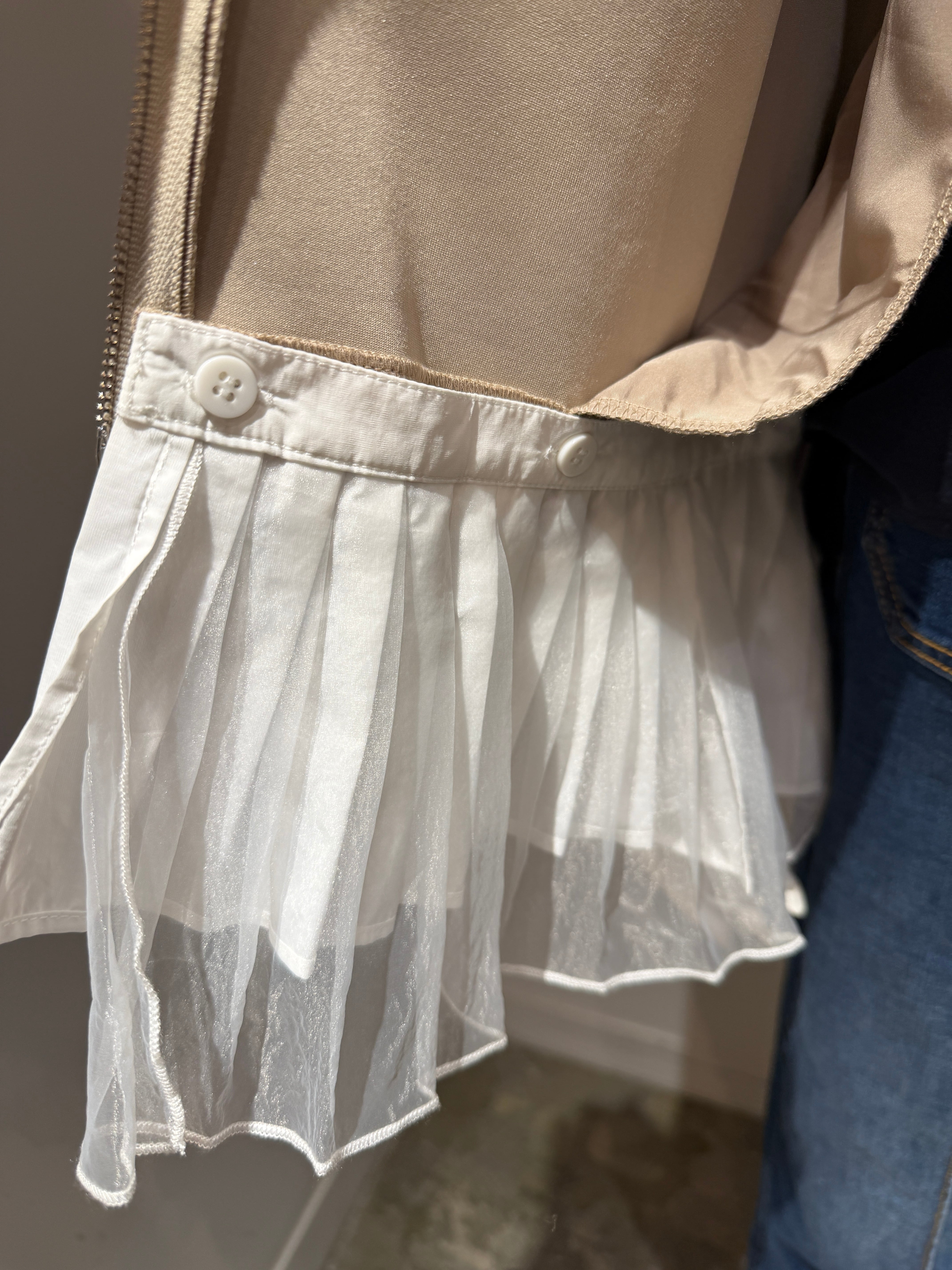 裾部分にはタフタ×オーガンジーの程良いフリルがふんわりと表情が優しい感じをプラス。