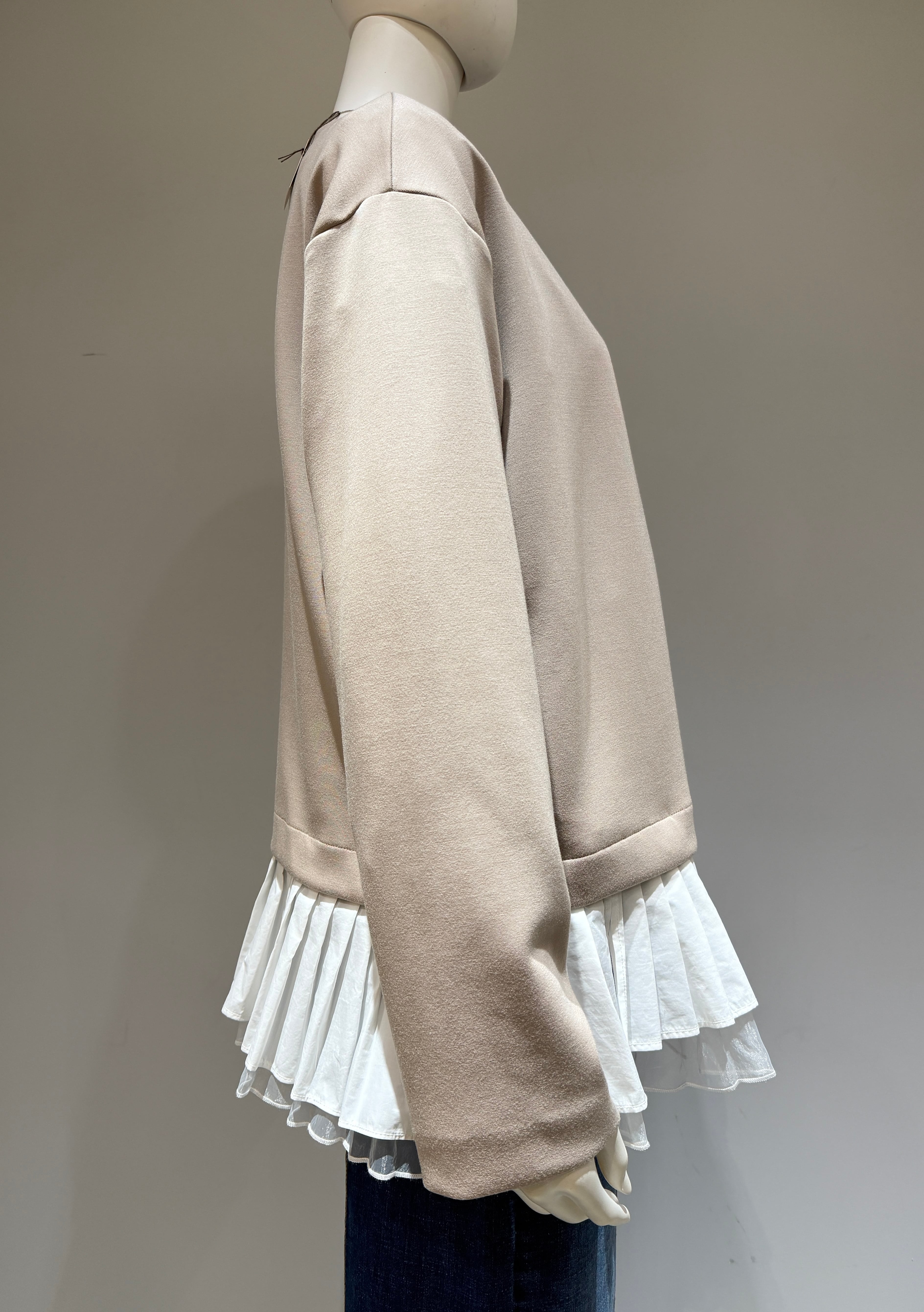 シンプルなノーカラーブルゾンの裾に異素材がアクセントになった大人の1枚が入荷しました。