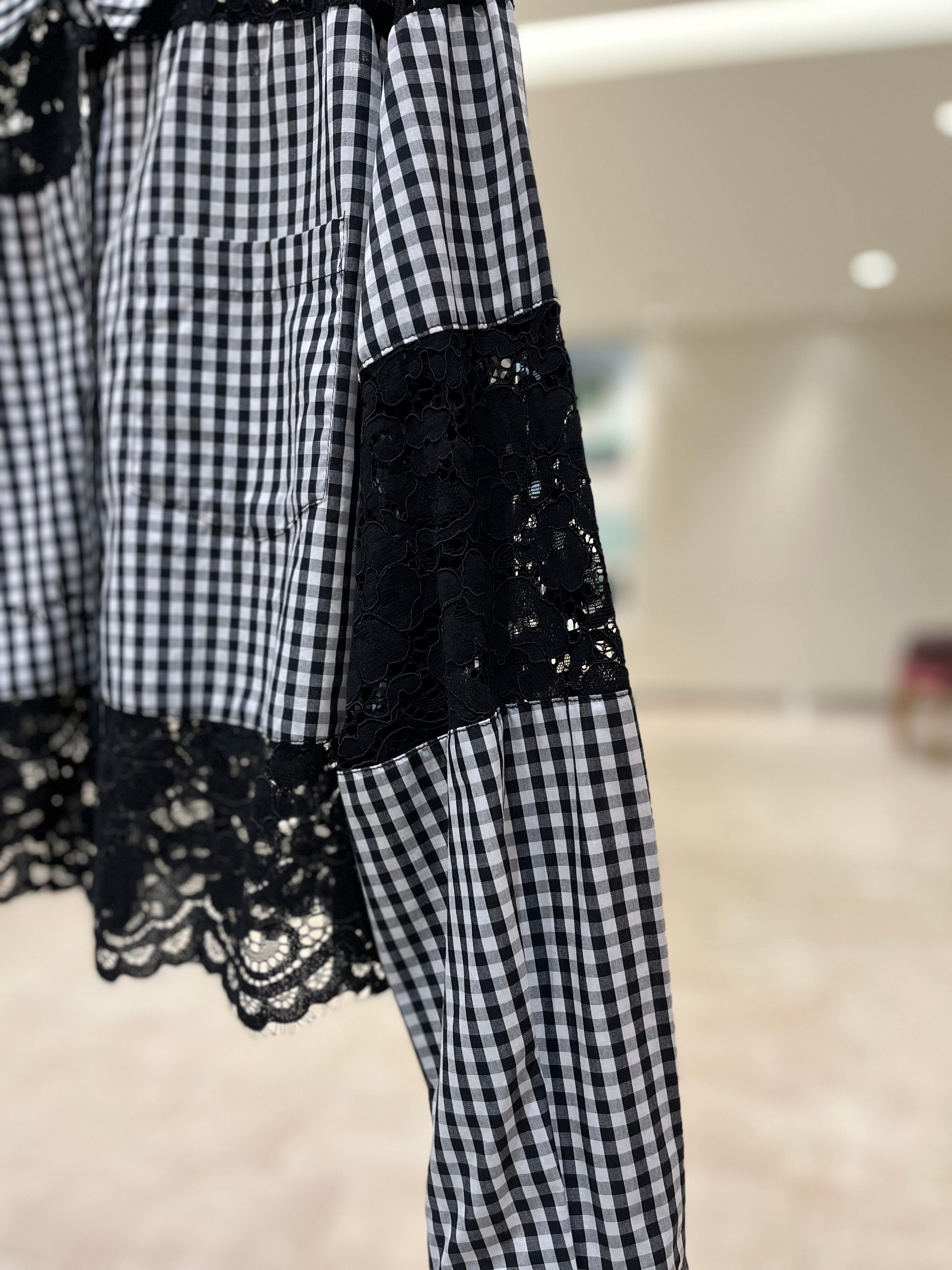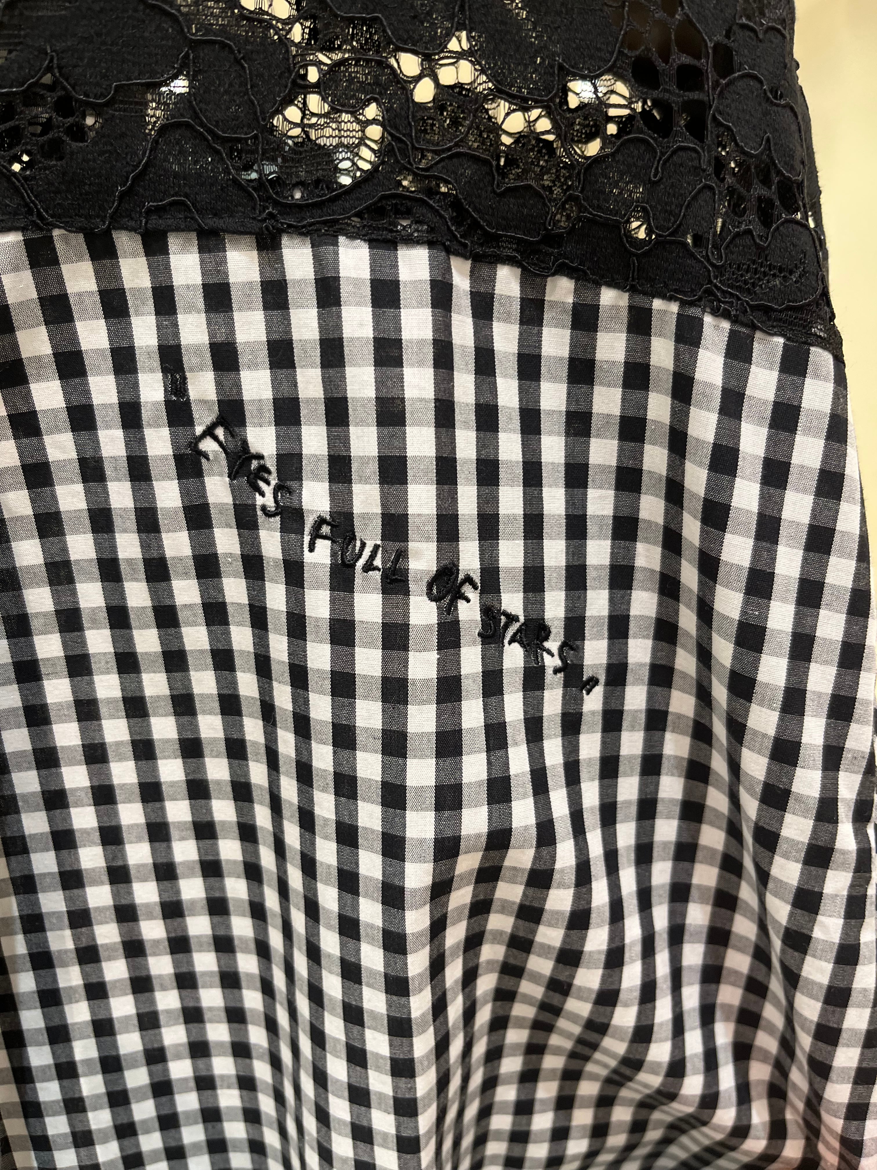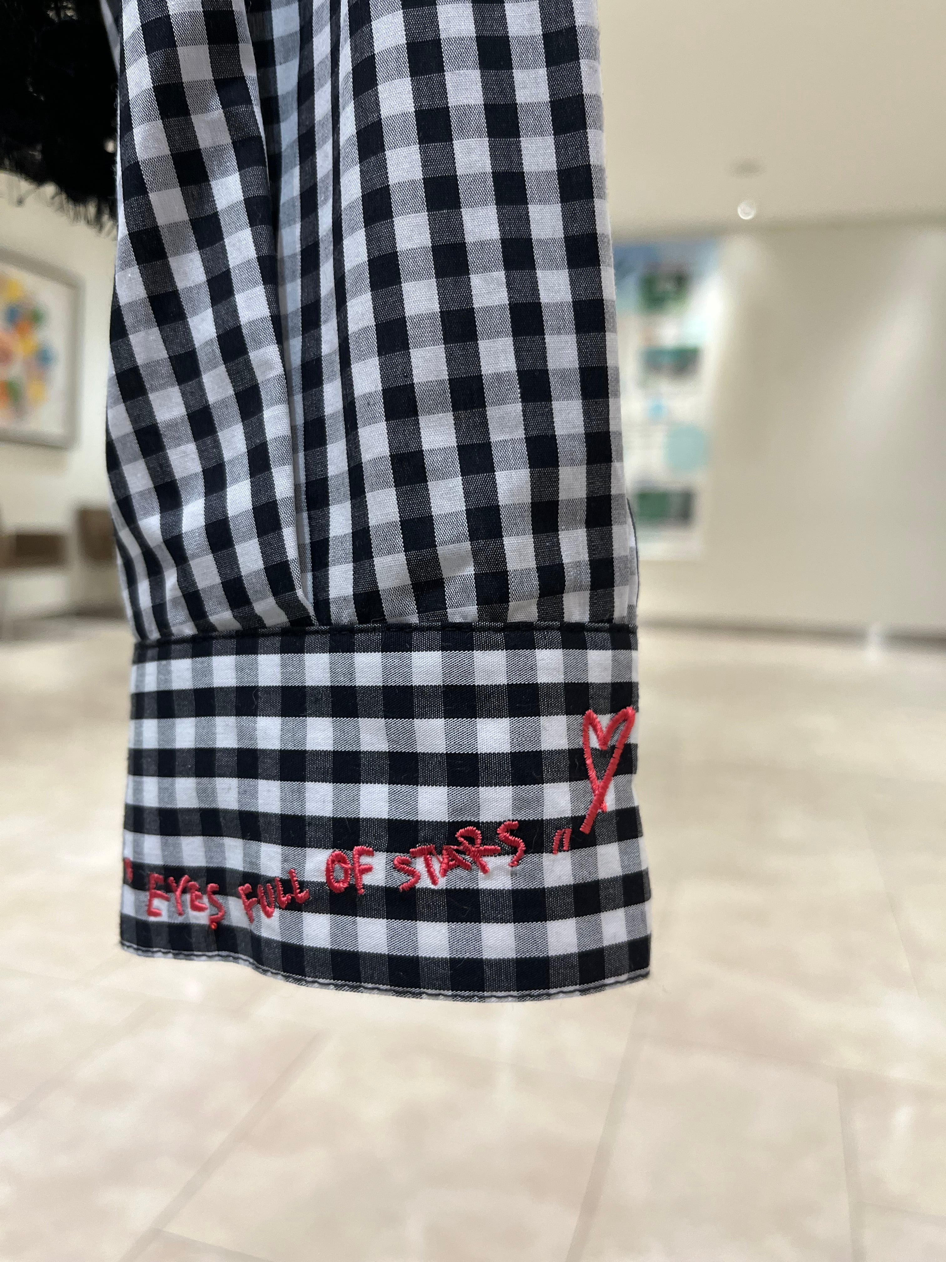 レース切り替えのシャツにランダム刺繍がほどこされた表情豊かなデザインシャツです。