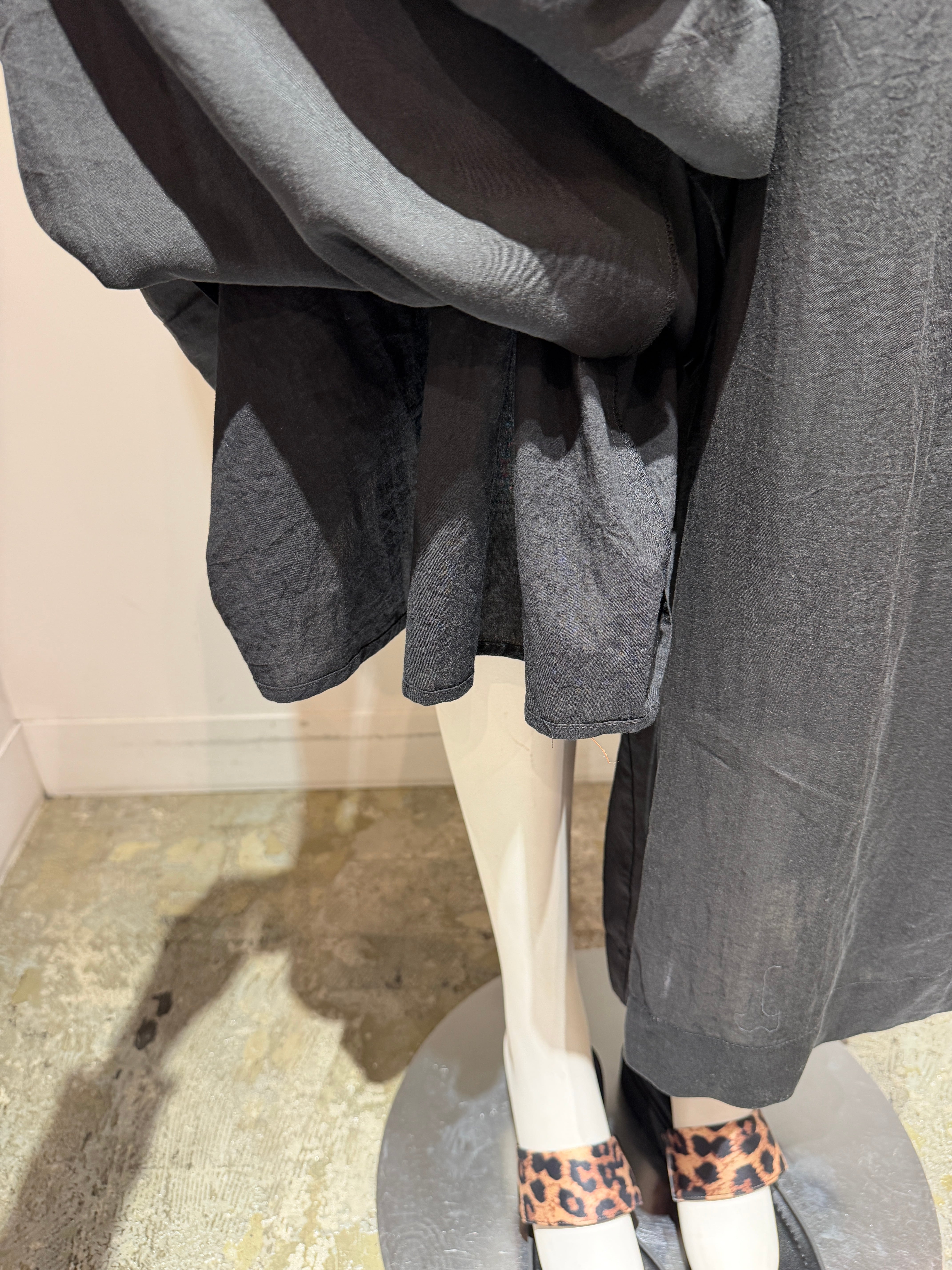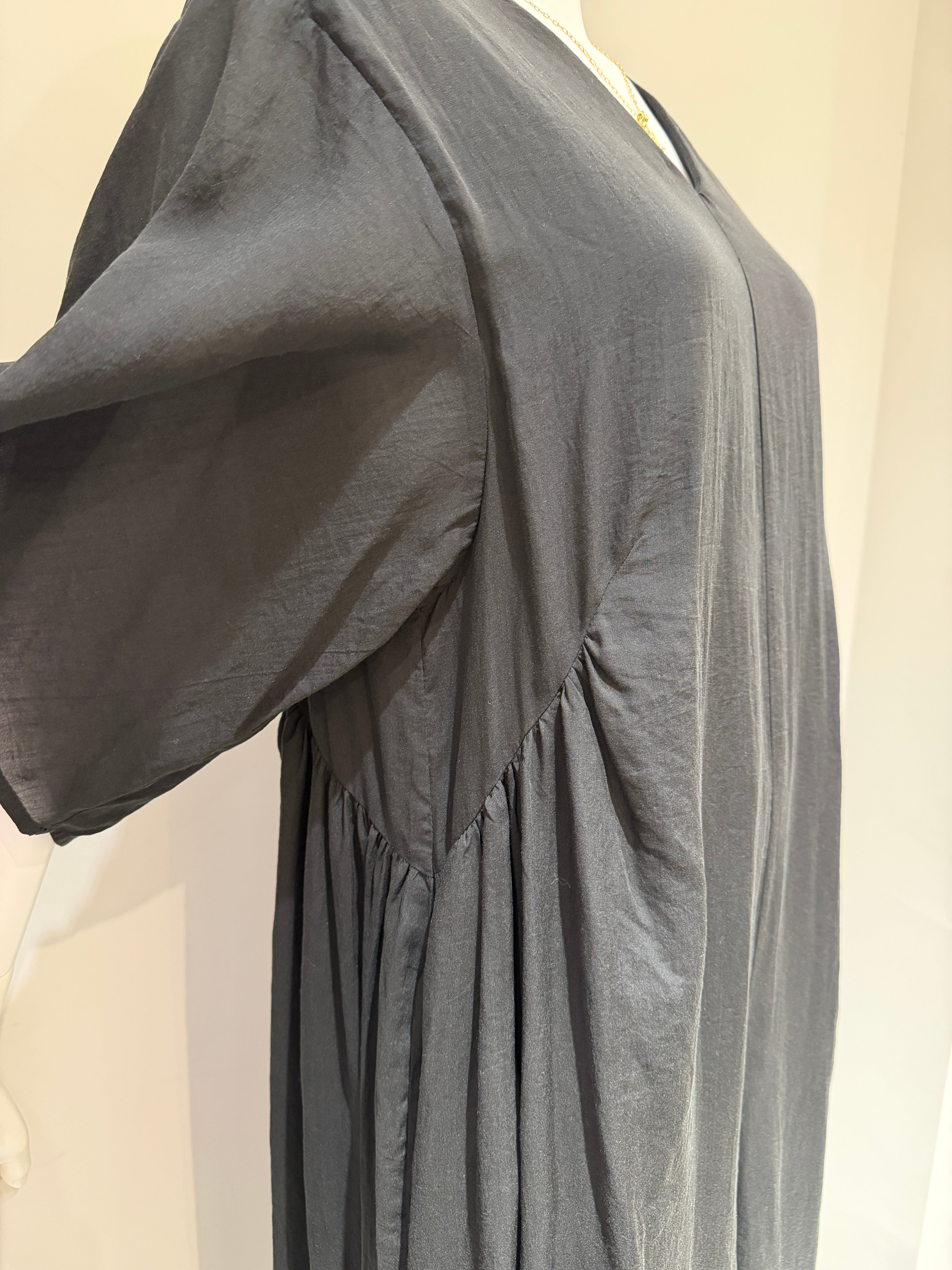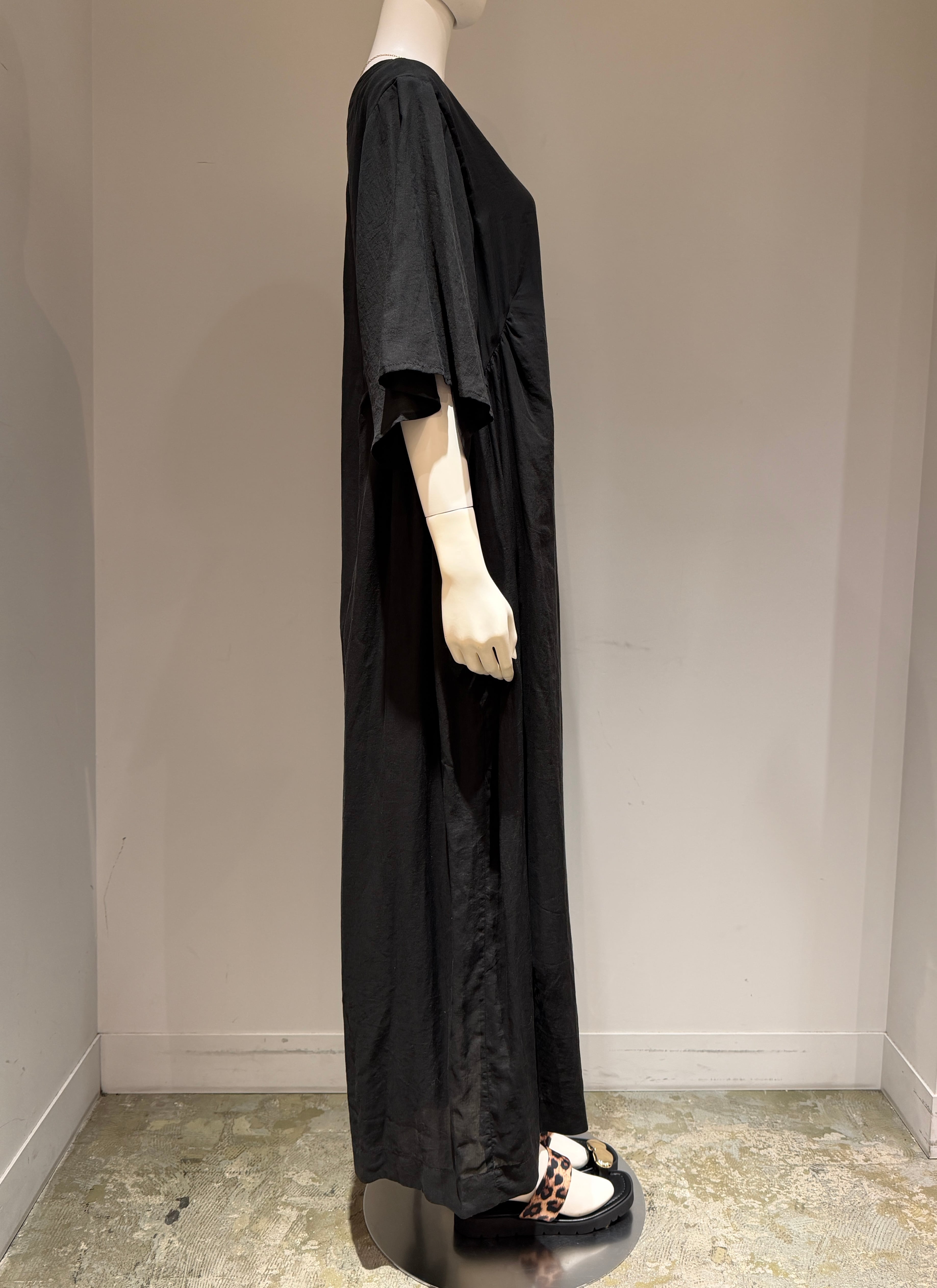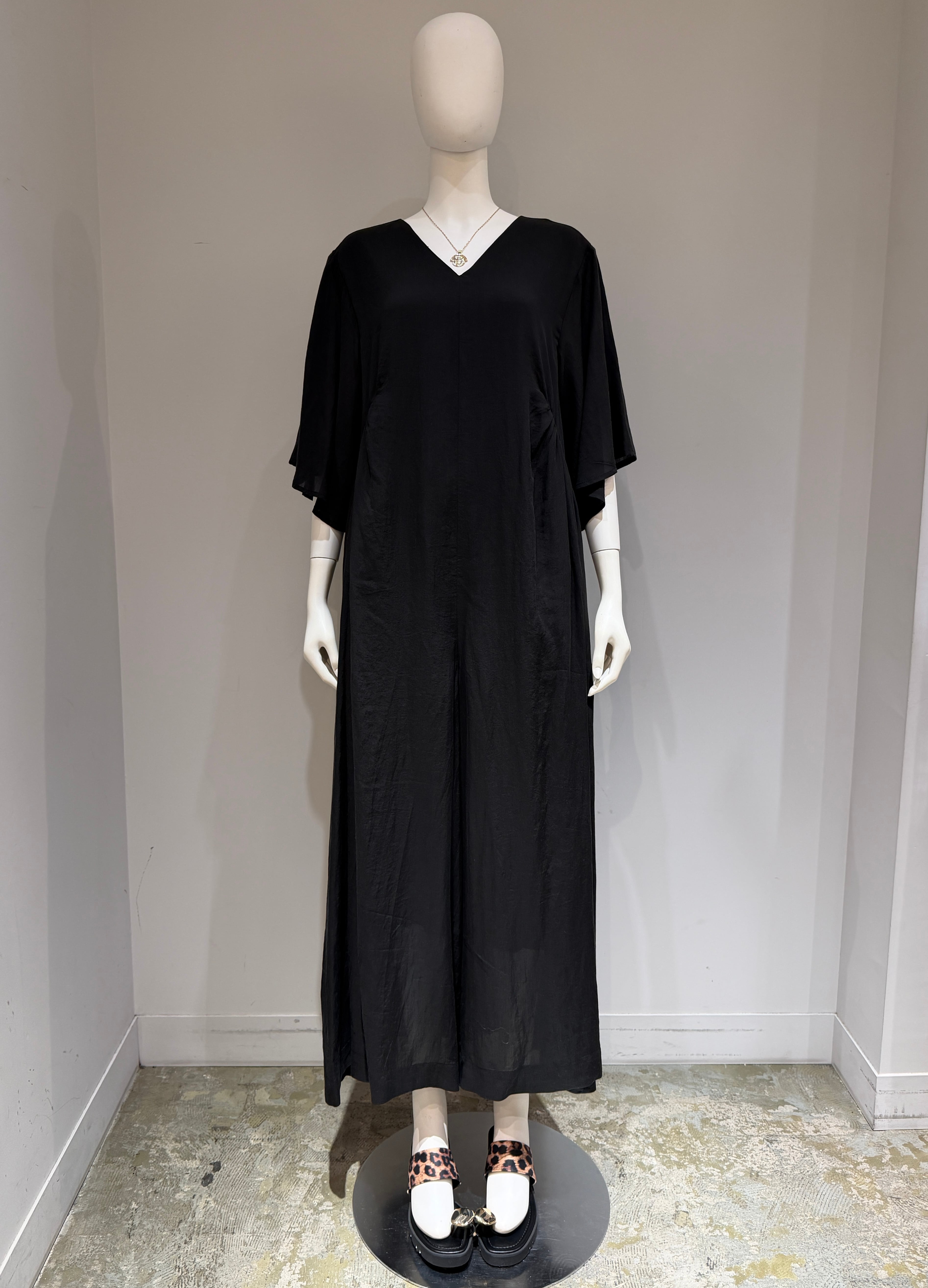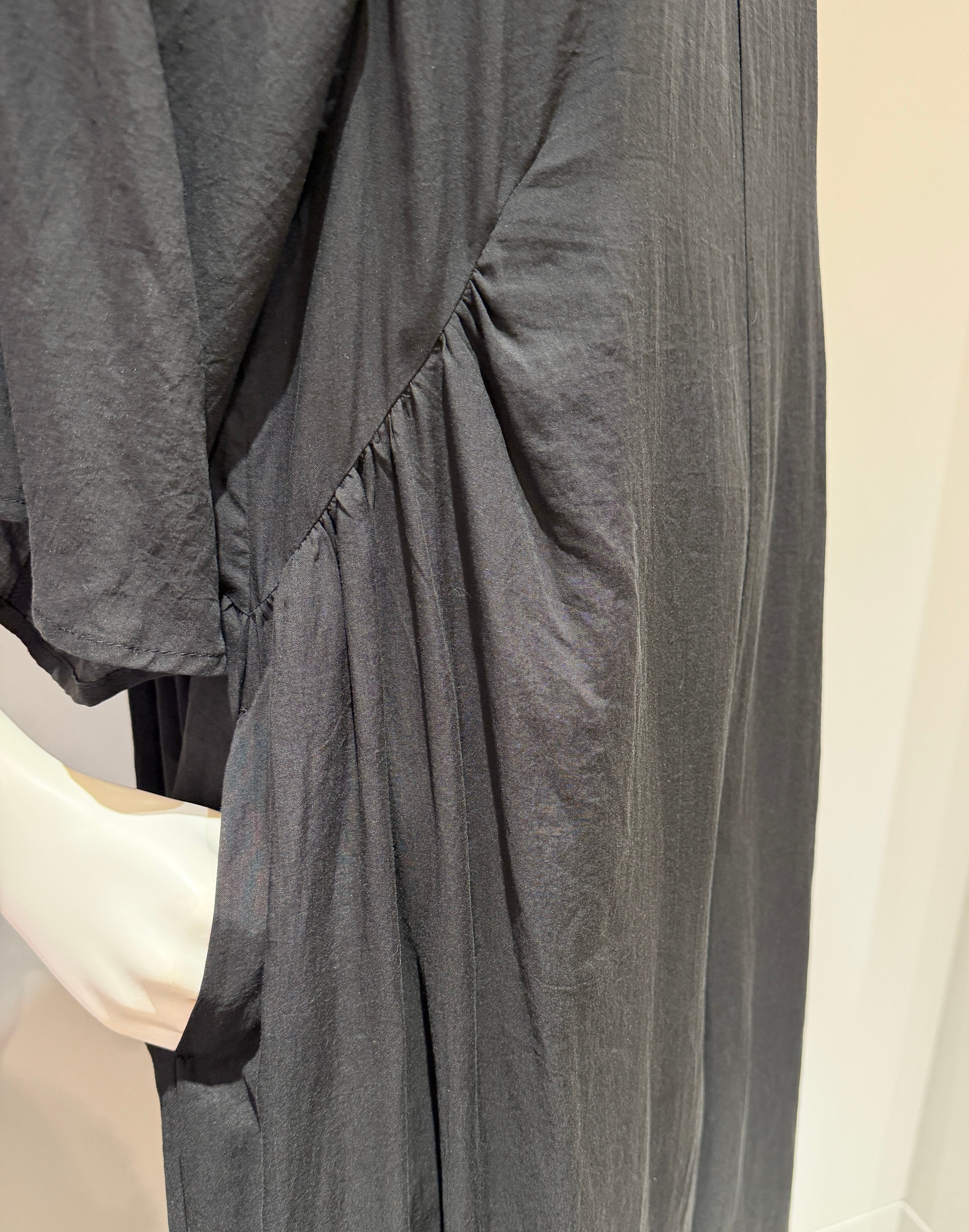 すっきりとしたVネック、ストンと落ち感のある5分袖、ボリューム感あるワイドシルエット。