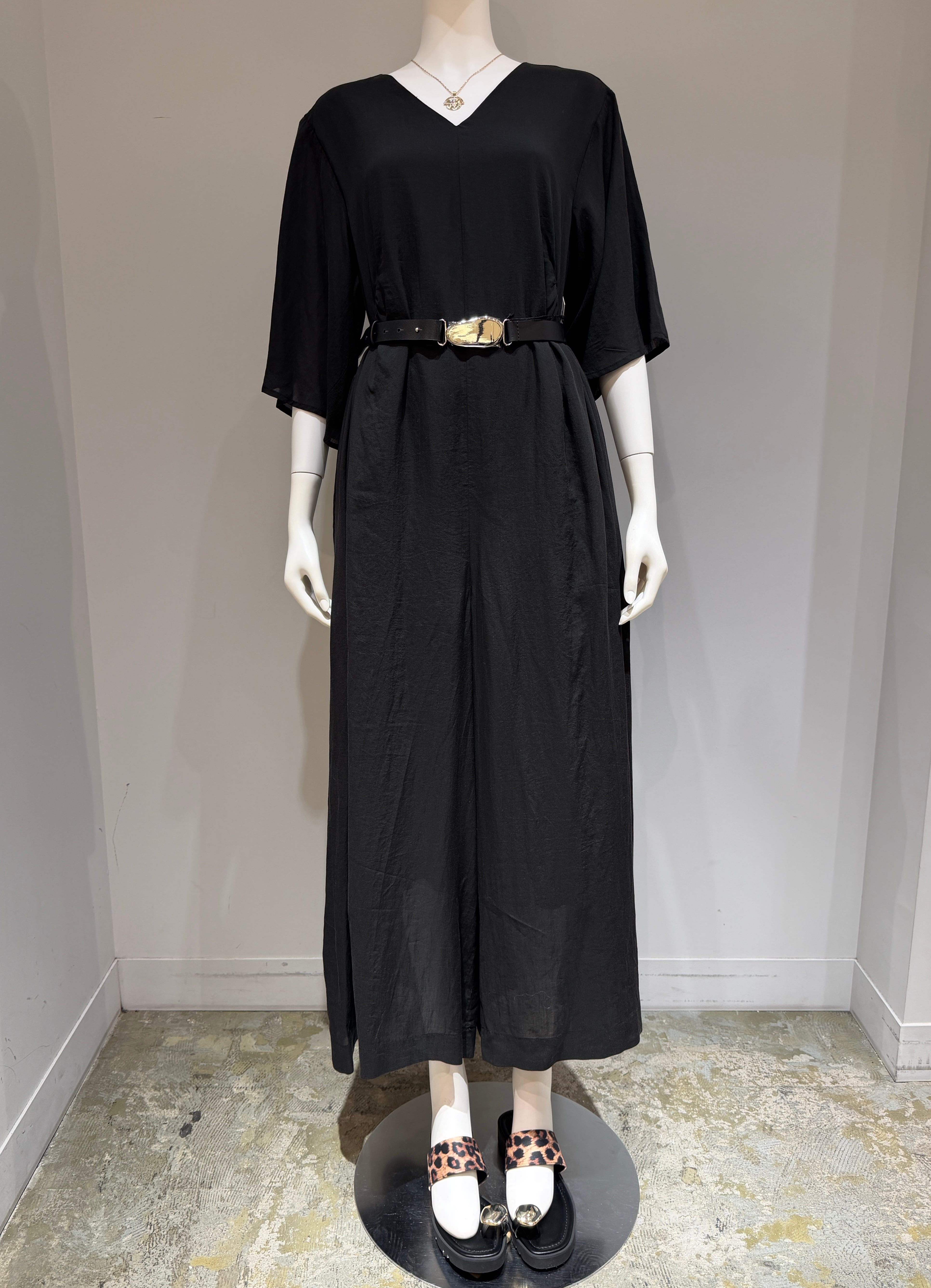 やわらかで軽やかな、光沢感ある素材を活かしたワイドパンツオールインワン。