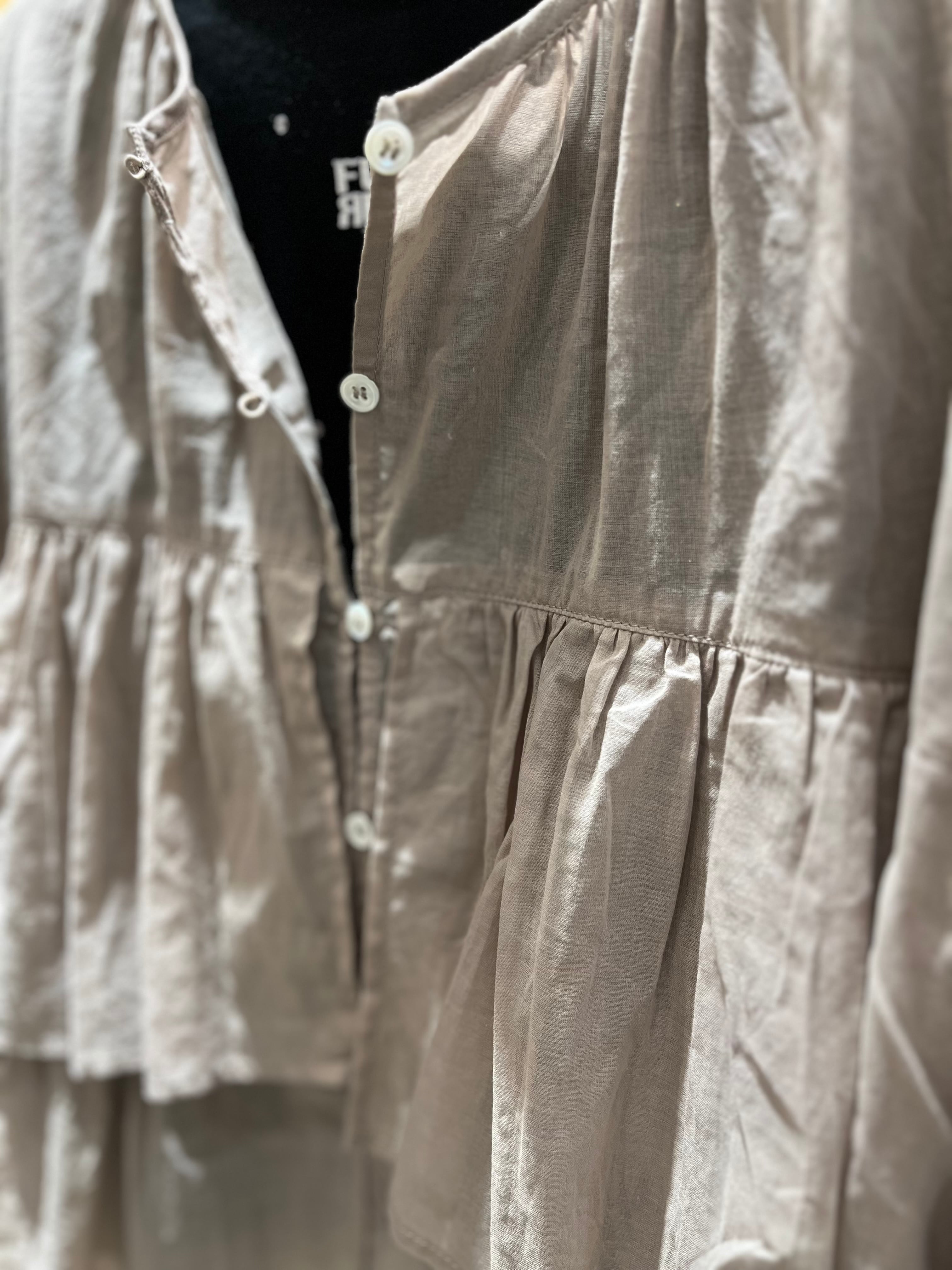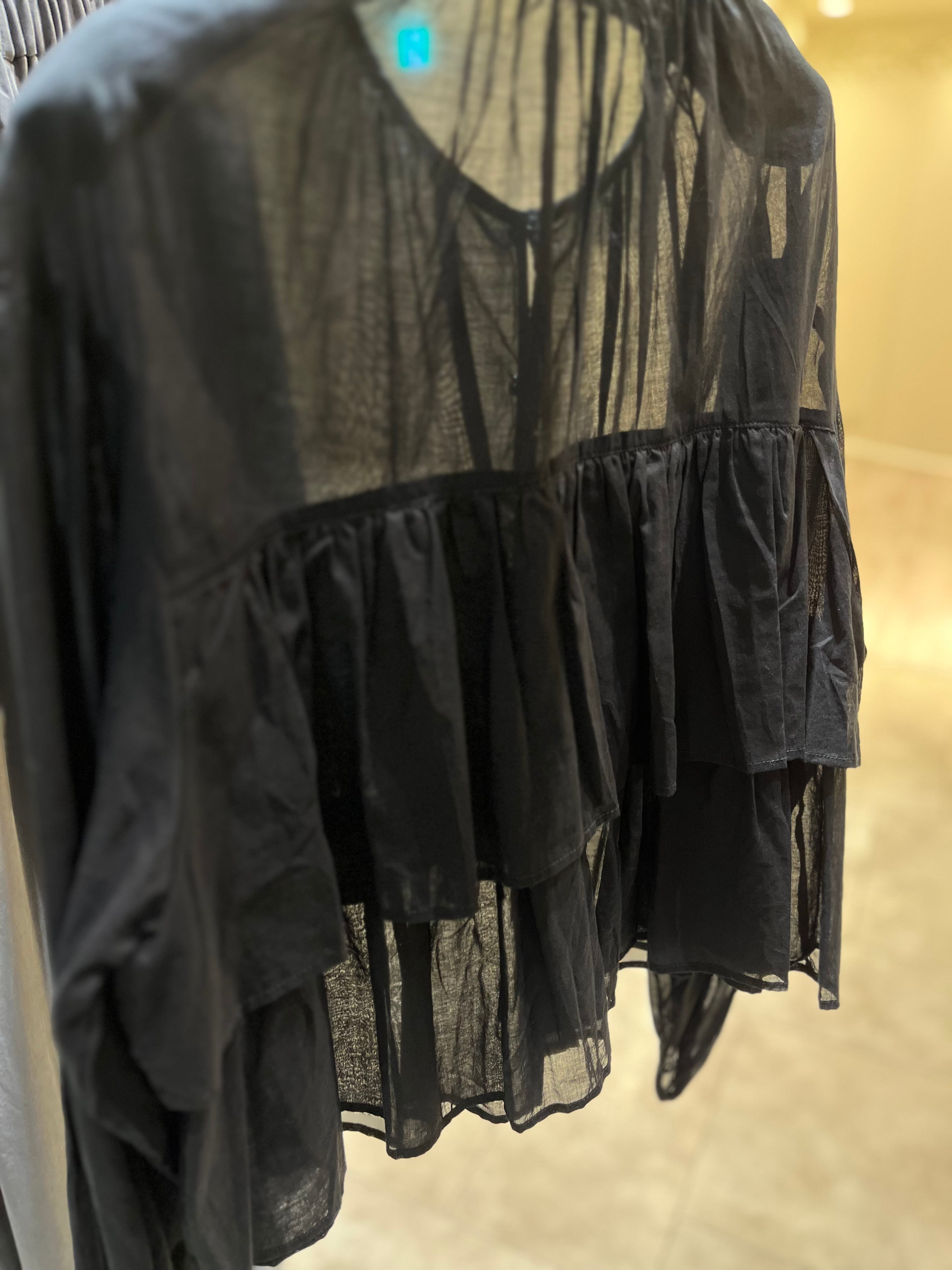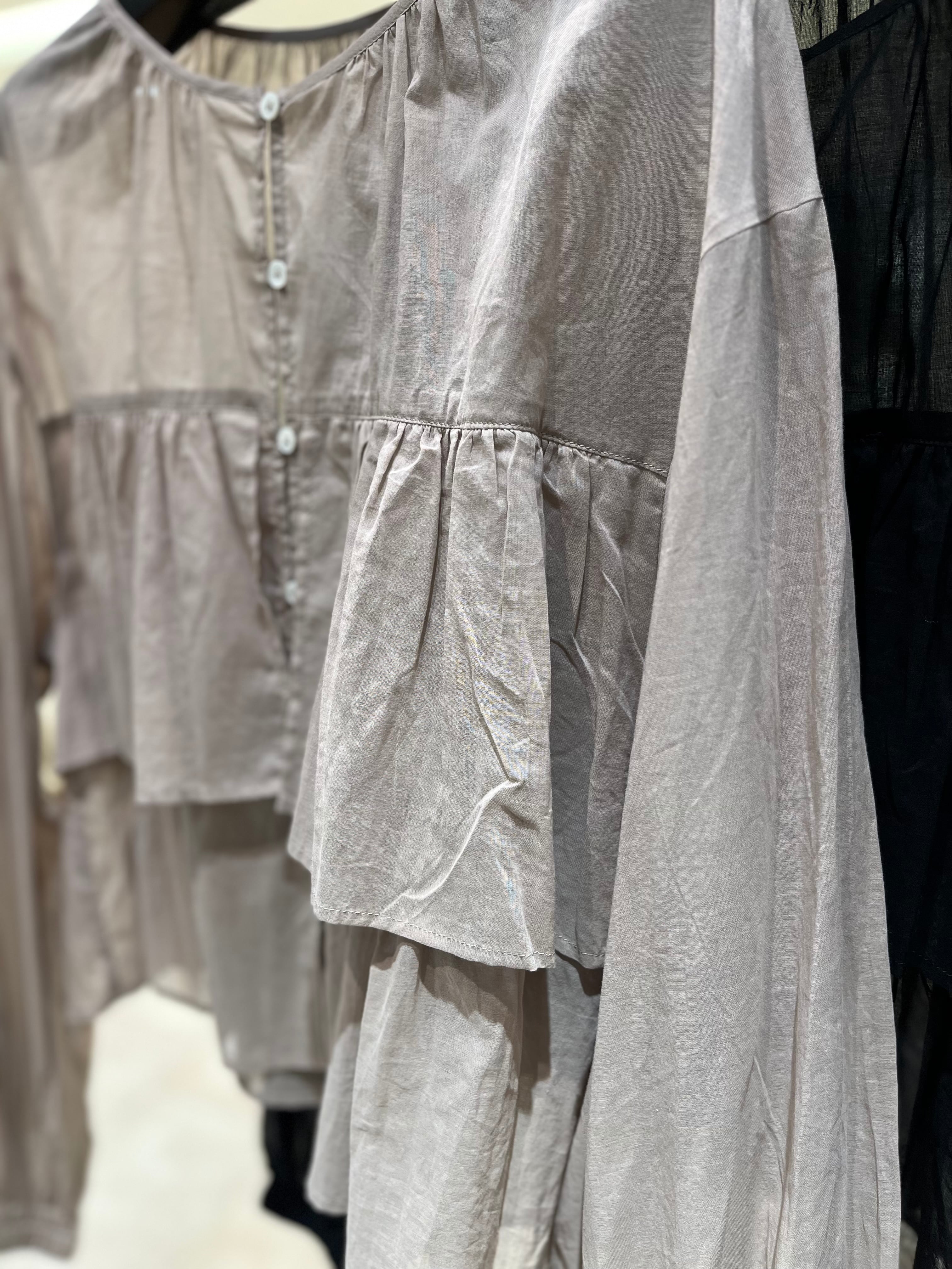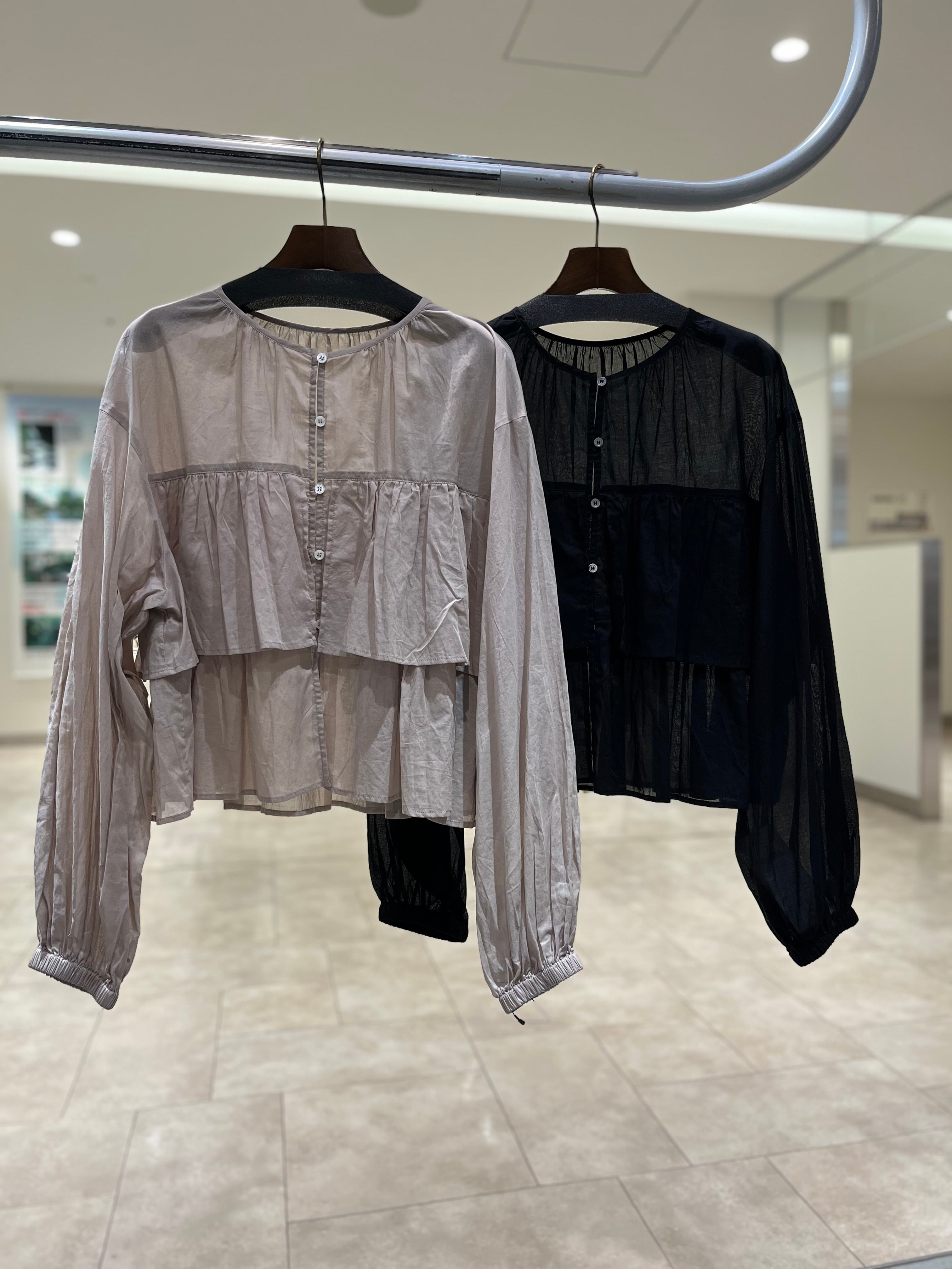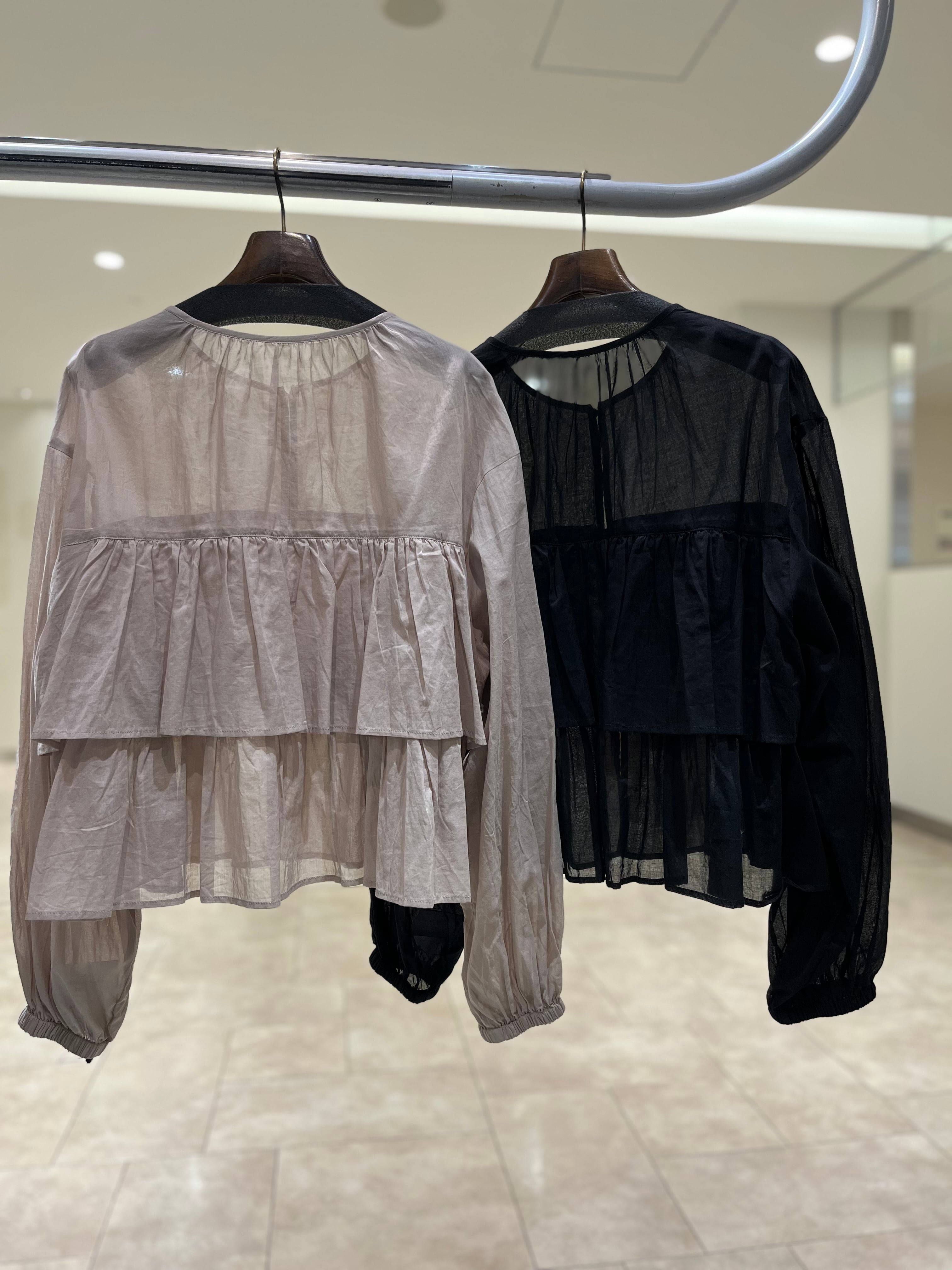 首元や袖口のギャザー、さらに前後にあしらわれたフリルがふんわりとしたフェミニンなシルエットに、そして柔らかさをプラスしてくれるアイテムです。