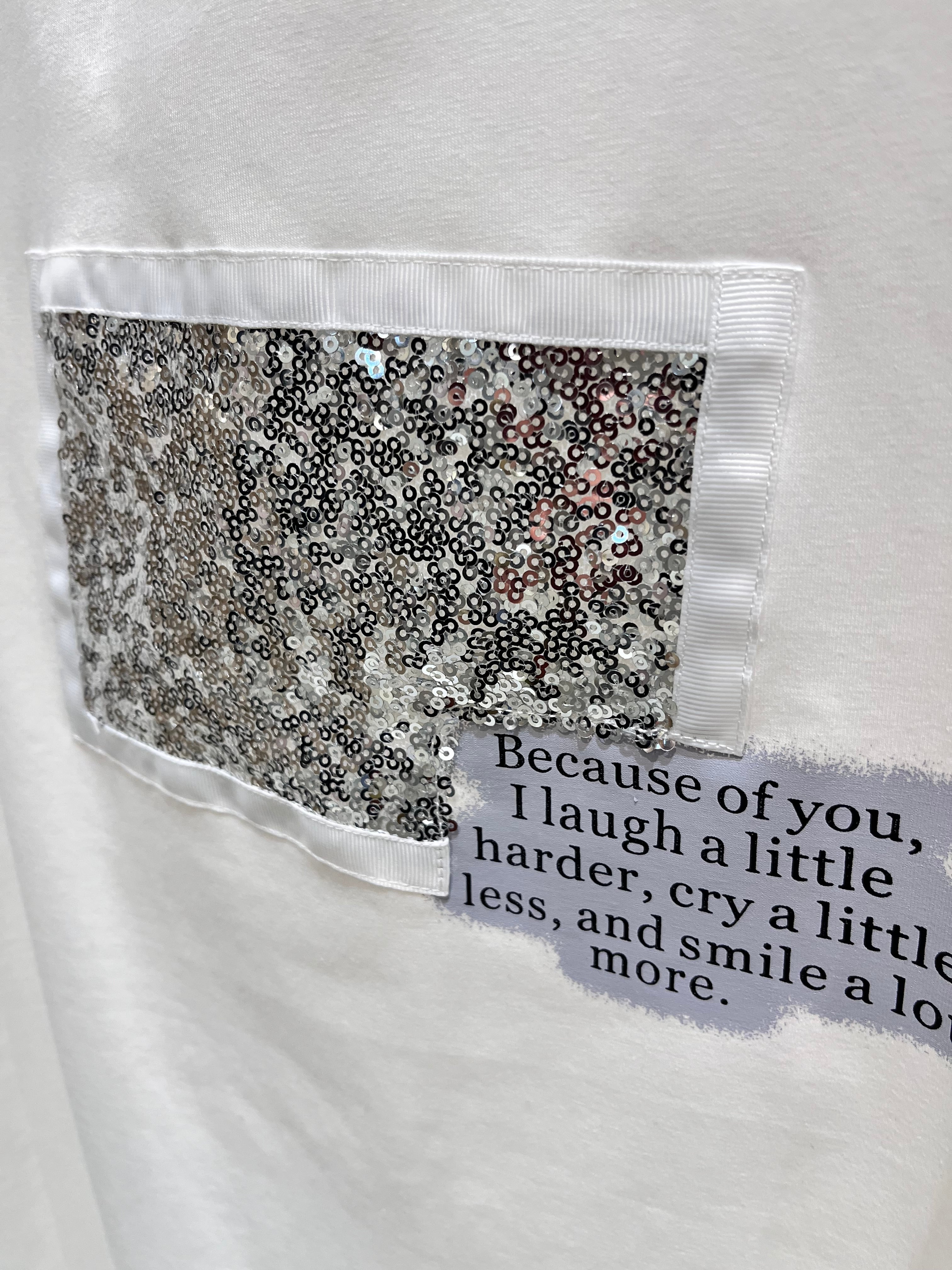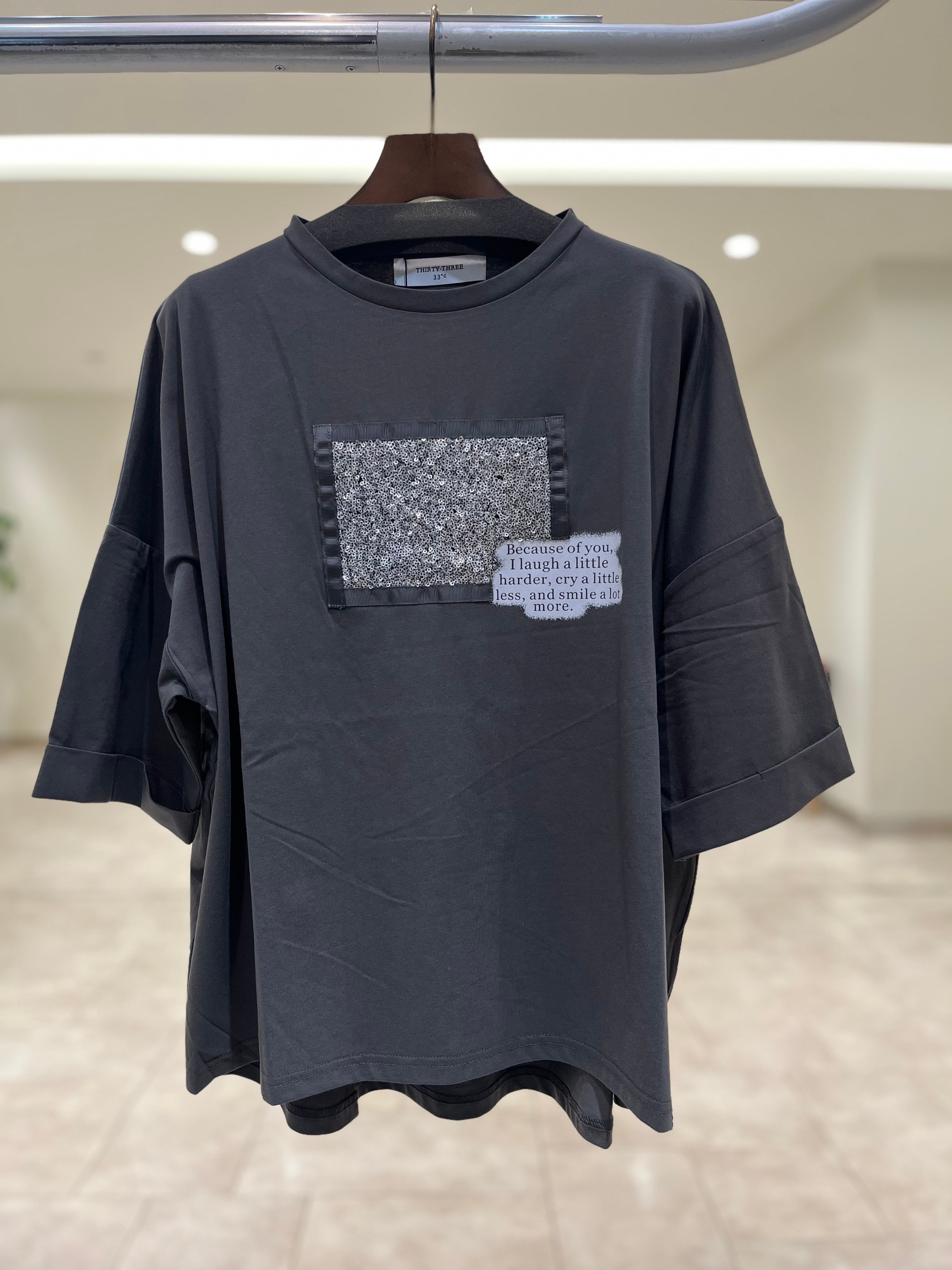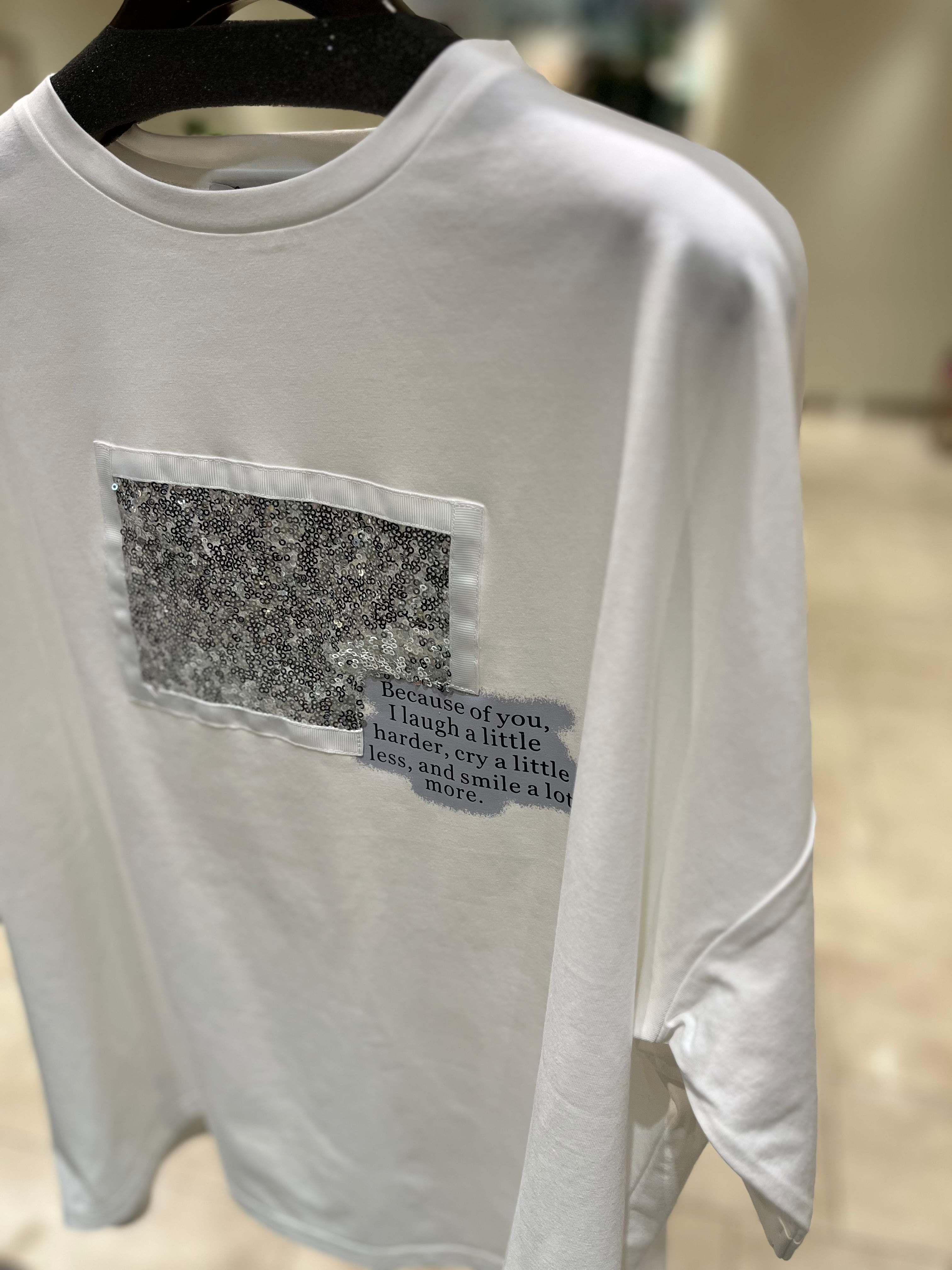 フロントに施されたスパンコールが目を惹くロゴTシャツです。