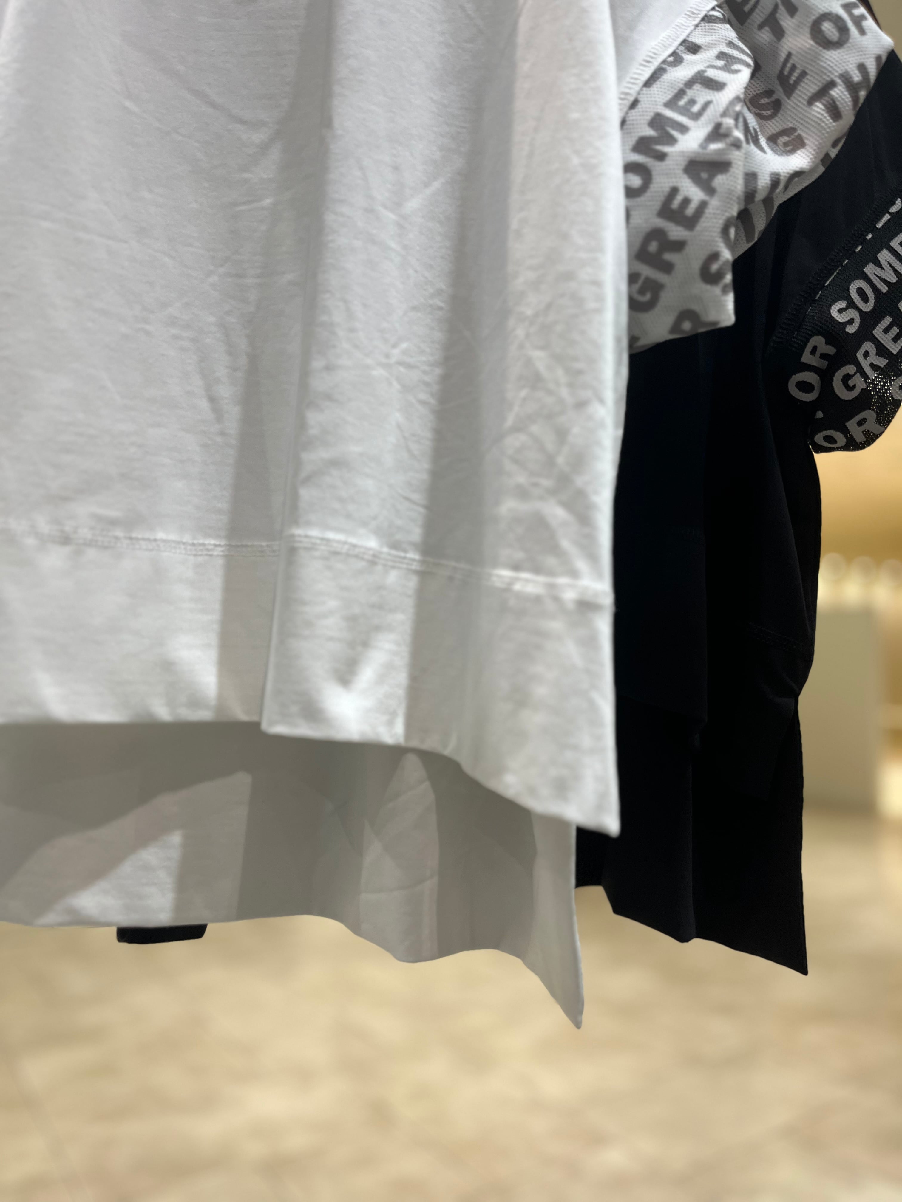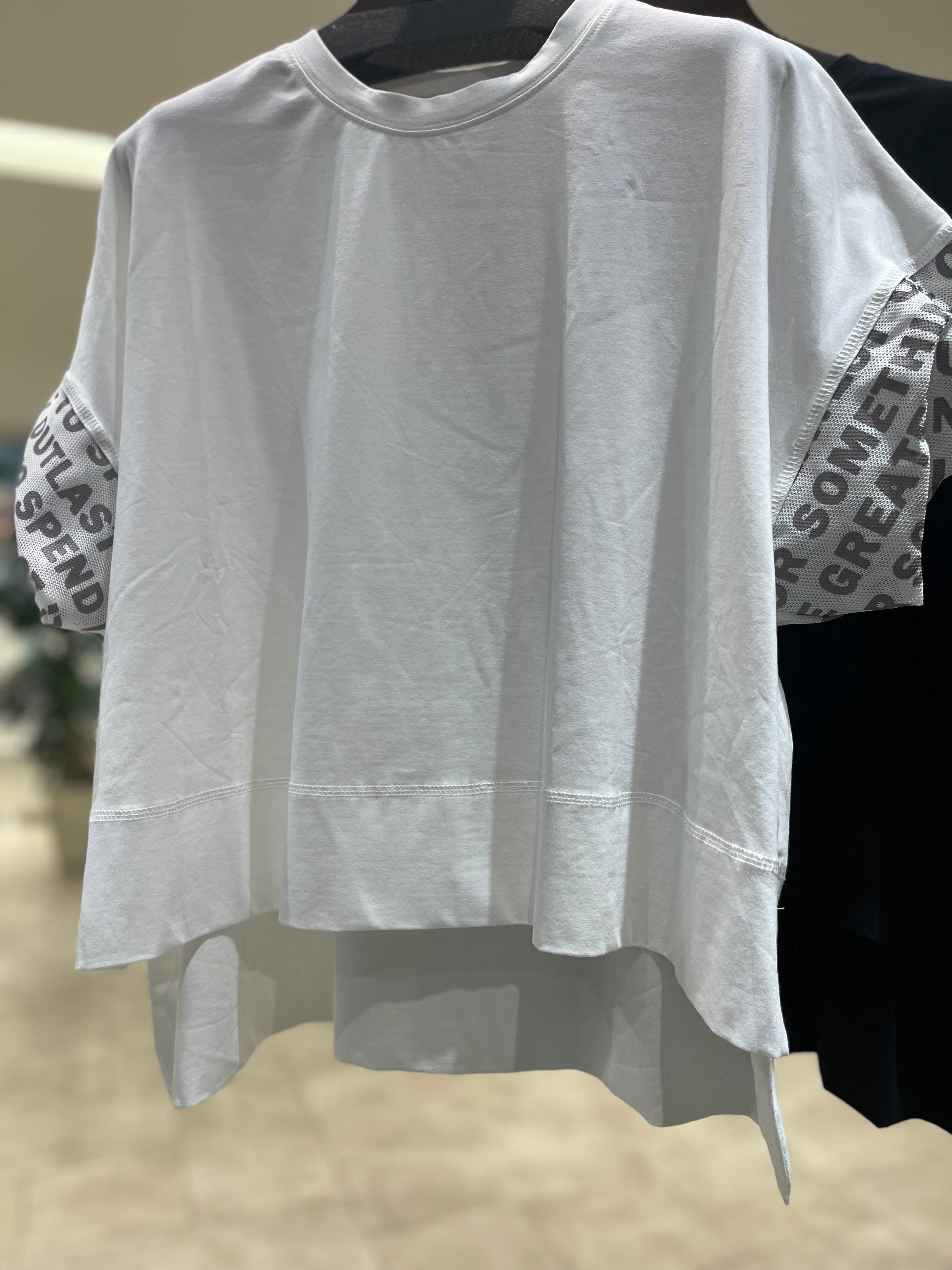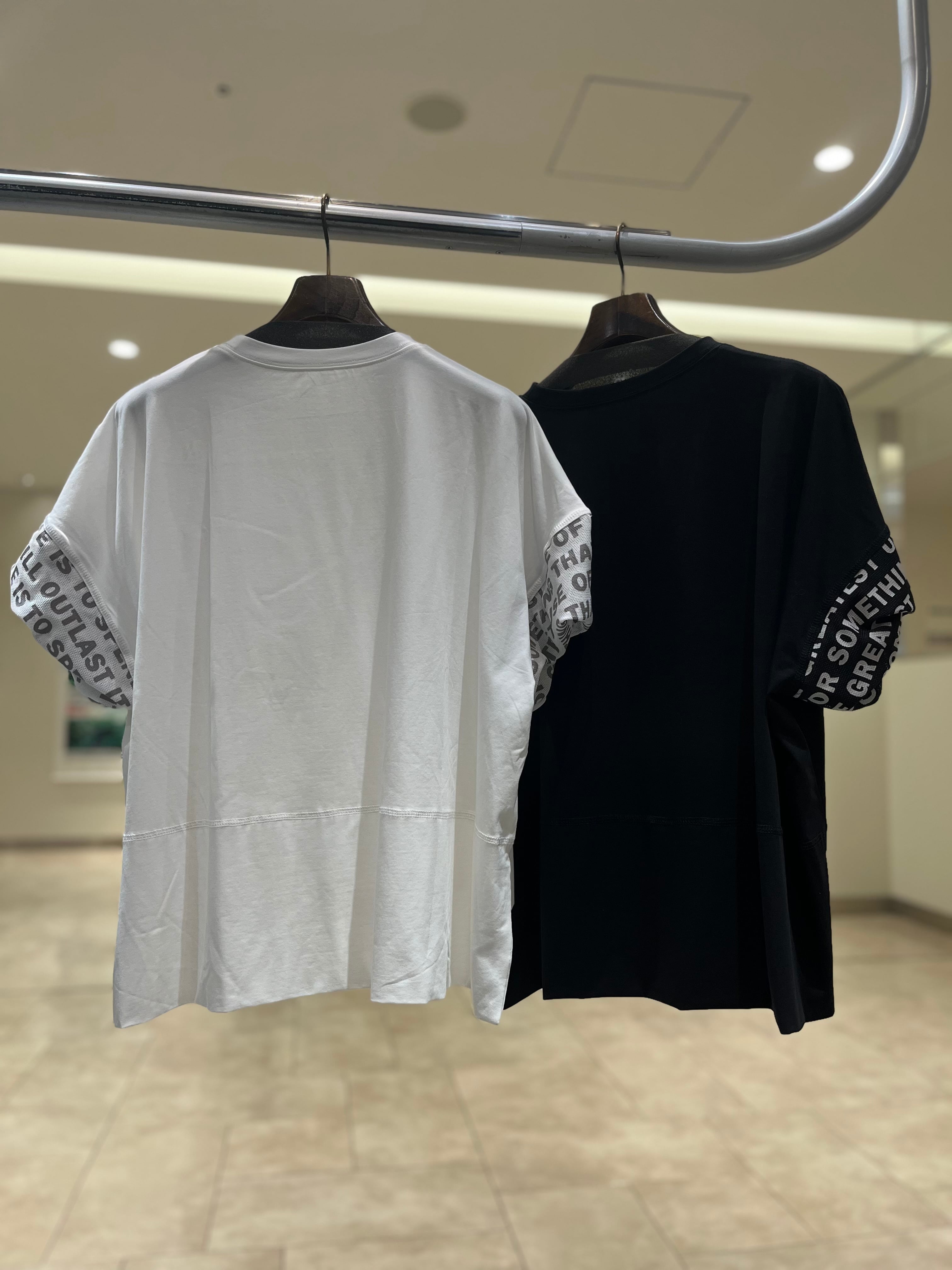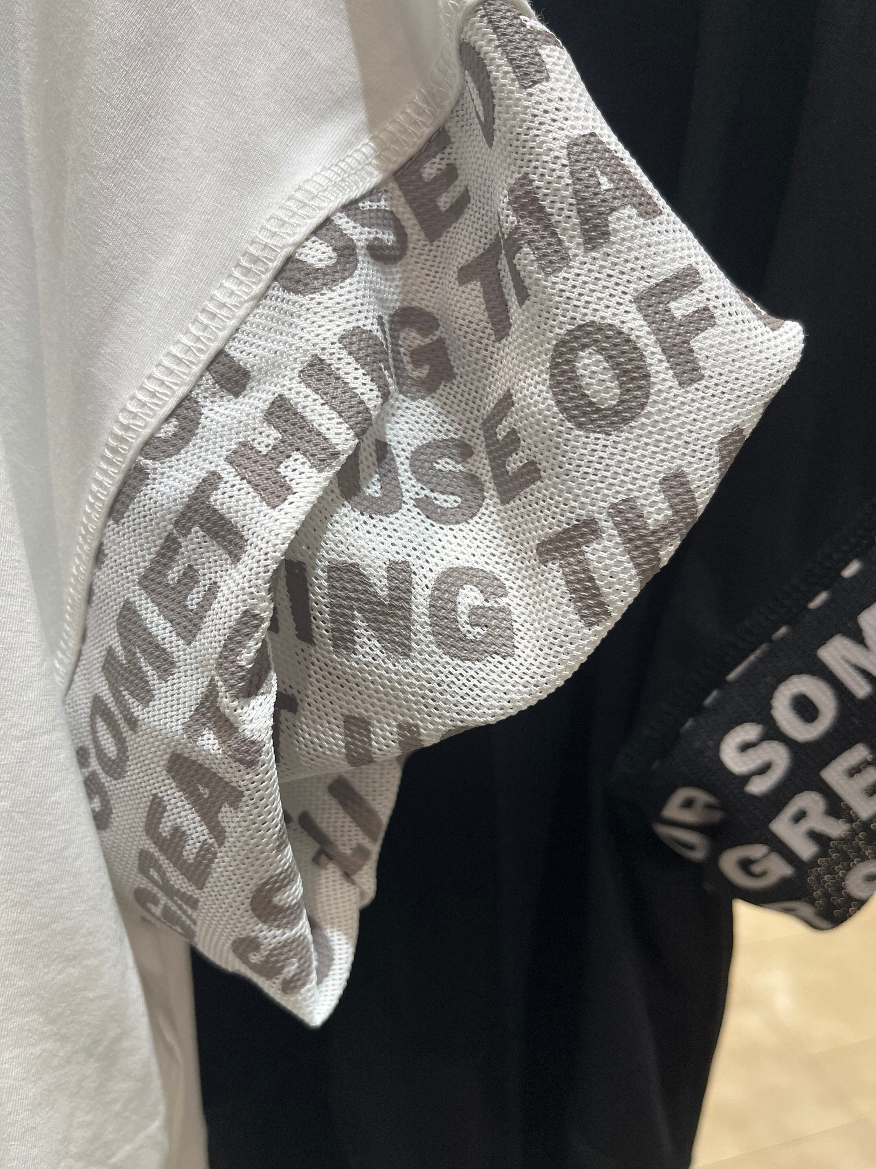 袖の一部にメッシュポリエステルが使用されており、夏らしい軽やかさと、遊び心のある異素材コンビのデザインが楽しめます。